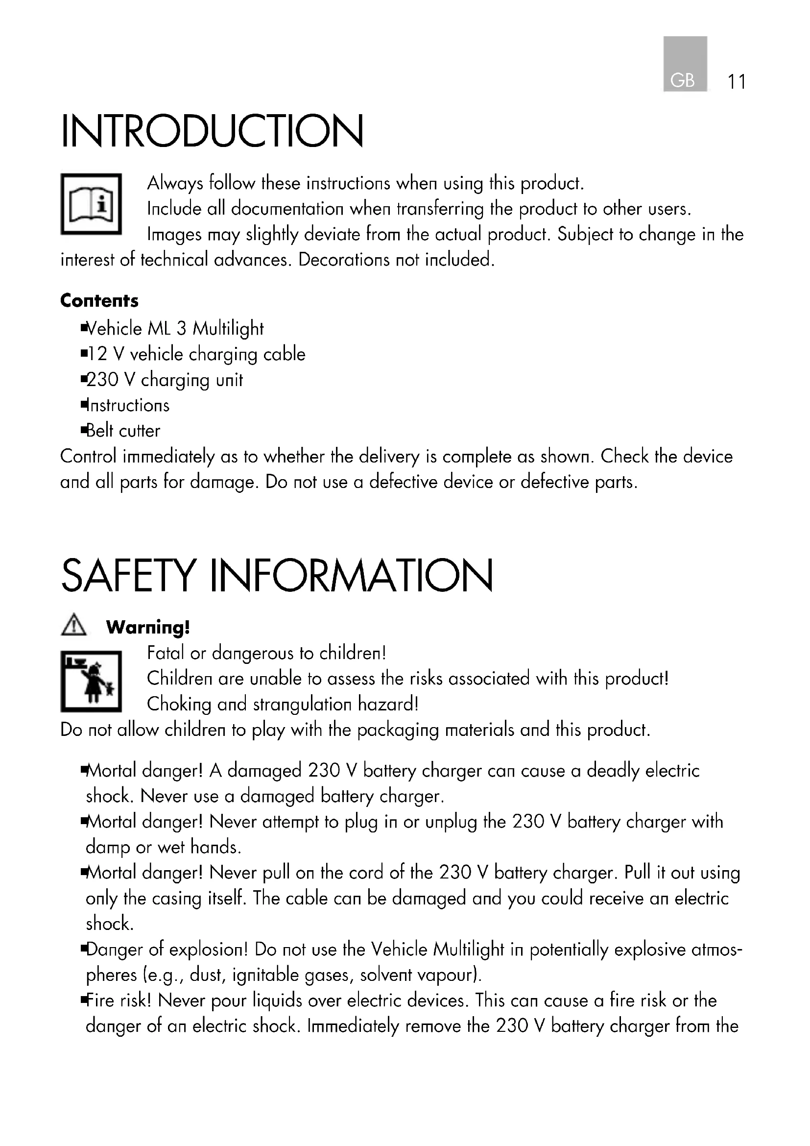 Warning! The Vehicle Multilight is not waterproof and not for use in humid surroundings.