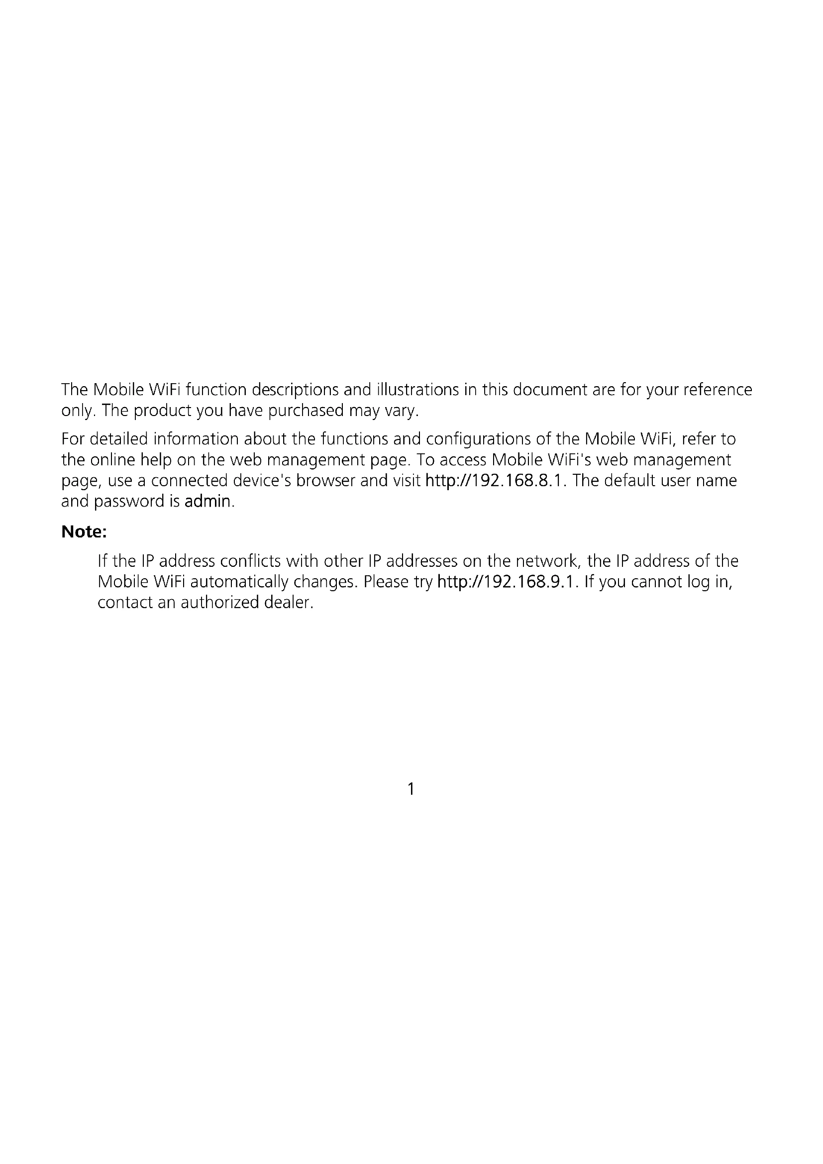 Quick Start1 The Mobile WiFi function descriptions and illustrations in this document are for your reference only. The product you have purchased may vary. For detailed information about the functions and configurations of the Mobile WiFi, refer to the online help on the web management page. To access Mobile WiFi's web management page, use a connected device's browser and visit http://192.168.8.1. The default user name and password is admin. Note: If the IP address conflicts with other IP addresses on the network, the IP address of the Mobile WiFi automatically changes. Please try http://192.168.9.1. If you cannot log in, contact an authorized dealer.2 Appearance