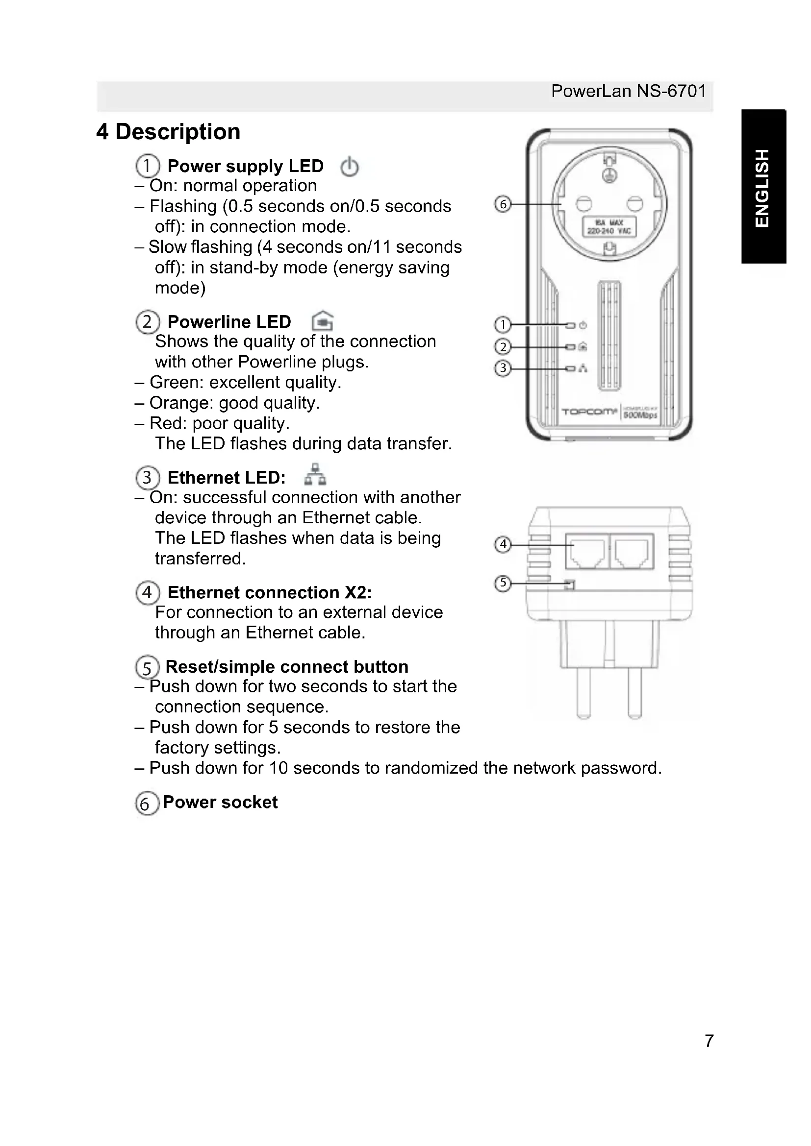 ENGLISH 4 Description Power supply LED – On: normal operation – Flashing (0.5 seconds on/0.5 seconds off): in connection mode. – Slow flashing (4 seconds on/11 seconds off): in stand-by mode (energy saving mode) Powerline LED Shows the quality of the connection with other Powerline plugs. – Green: excellent quality. – Orange: good quality. – Red: poor quality. The LED flashes during data transfer. Ethernet LED: – On: successful connection with another device through an Ethernet cable. The LED flashes when data is being transferred. Ethernet connection X2: For connection to an external device through an Ethernet cable. Reset/simple connect button – Push down for two seconds to start the connection sequence. – Push down for 5 seconds to restore the factory settings. – Push down for 10 seconds to randomized the network password. Power socket