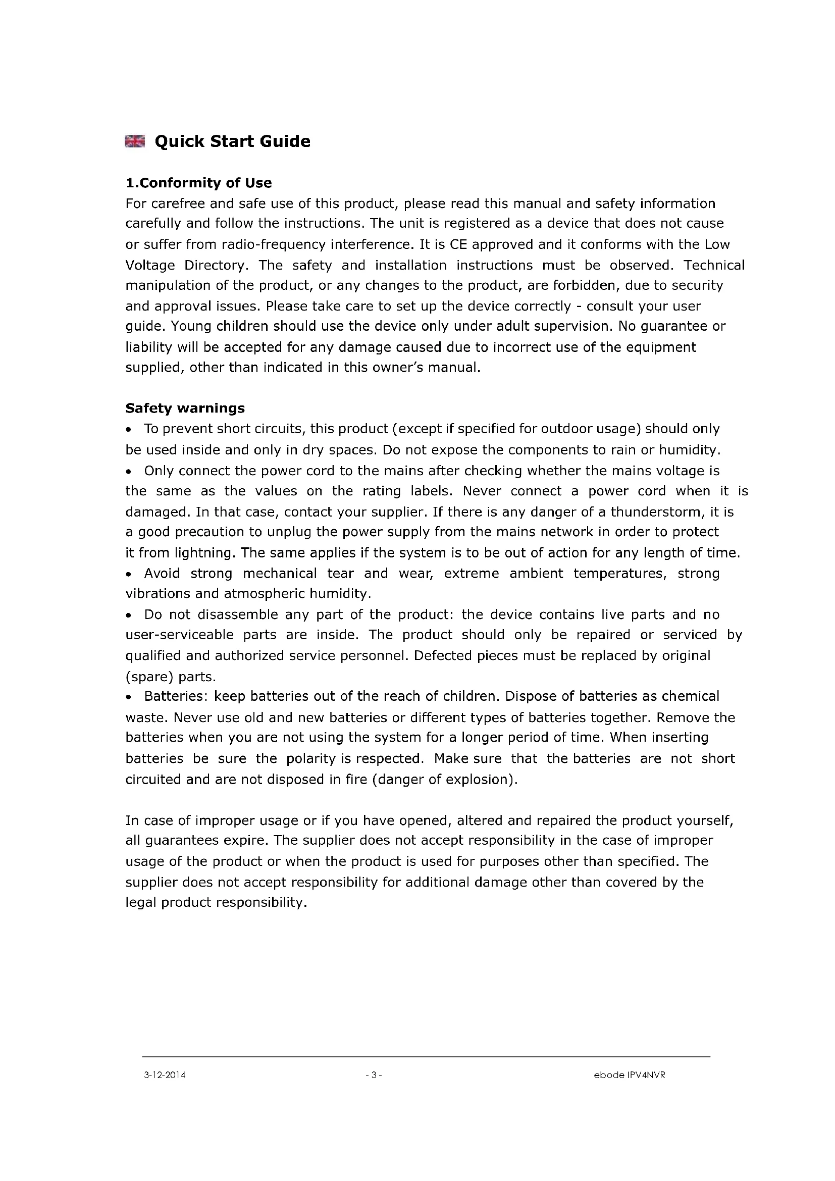 Technical Specification: 4-Channel 720P/960P HD IP Cam Network Video Recorder (NVR) H.264 Main Profile Video Compression Supports HDMI and VGA Local Display 4-Channel 960P Synchronous Playback Compatible with ebode HD IP Cameras Supports ONVIF protocol, compatible with ONVIF-embedded IP Cameras Supports USB External Storage (Flash disk, HDD)3-12-2014 - 3 - ebode IPV4NVR Quick Start Guide 1.Conformity of Use For carefree and safe use of this product, please read this manual and safety information carefully and follow the instructions. The unit is registered as a device that does not cause or suffer from radio-frequency interference. It is CE approved and it conforms with the Low Voltage Directory. The safety and installation instructions must be observed. Technical manipulation of the product, or any changes to the product, are forbidden, due to security and approval issues. Please take care to set up the device correctly - consult your user guide. Young children should use the device only under adult supervision. No guarantee or liability will be accepted for any damage caused due to incorrect use of the equipment supplied, other than indicated in this owner’s manual. Safety warnings To prevent short circuits, this product (except if specified for outdoor usage) should only be used inside and only in dry spaces. Do not expose the components to rain or humidity. Only connect the power cord to the mains after checking whether the mains voltage is the same as the values on the rating labels. Never connect a power cord when it is damaged. In that case, contact your supplier. If there is any danger of a thunderstorm, it is a good precaution to unplug the power supply from the mains network in order to protect it from lightning. The same applies if the system is to be out of action for any length of time. Avoid strong mechanical tear and wear, extreme ambient temperatures, strong vibrations and atmospheric humidity. Do not disassemble any part of the product: the device contains live parts and no user-serviceable parts are inside. The product should only be repaired or serviced by qualified and authorized service personnel. Defected pieces must be replaced by original (spare) parts. Batteries: keep batteries out of the reach of children. Dispose of batteries as chemical waste. Never use old and new batteries or different types of batteries together. Remove the batteries when you are not using the system for a longer period of time. When inserting batteries be sure the polarity is respected. Make sure that the batteries are not short circuited and are not disposed in fire (danger of explosion). In case of improper usage or if you have opened, altered and repaired the product yourself, all guarantees expire. The supplier does not accept responsibility in the case of improper usage of the product or when the product is used for purposes other than specified. The supplier does not accept responsibility for additional damage other than covered by the legal product responsibility.3-12-2014 - 4 - ebode IPV4NVR