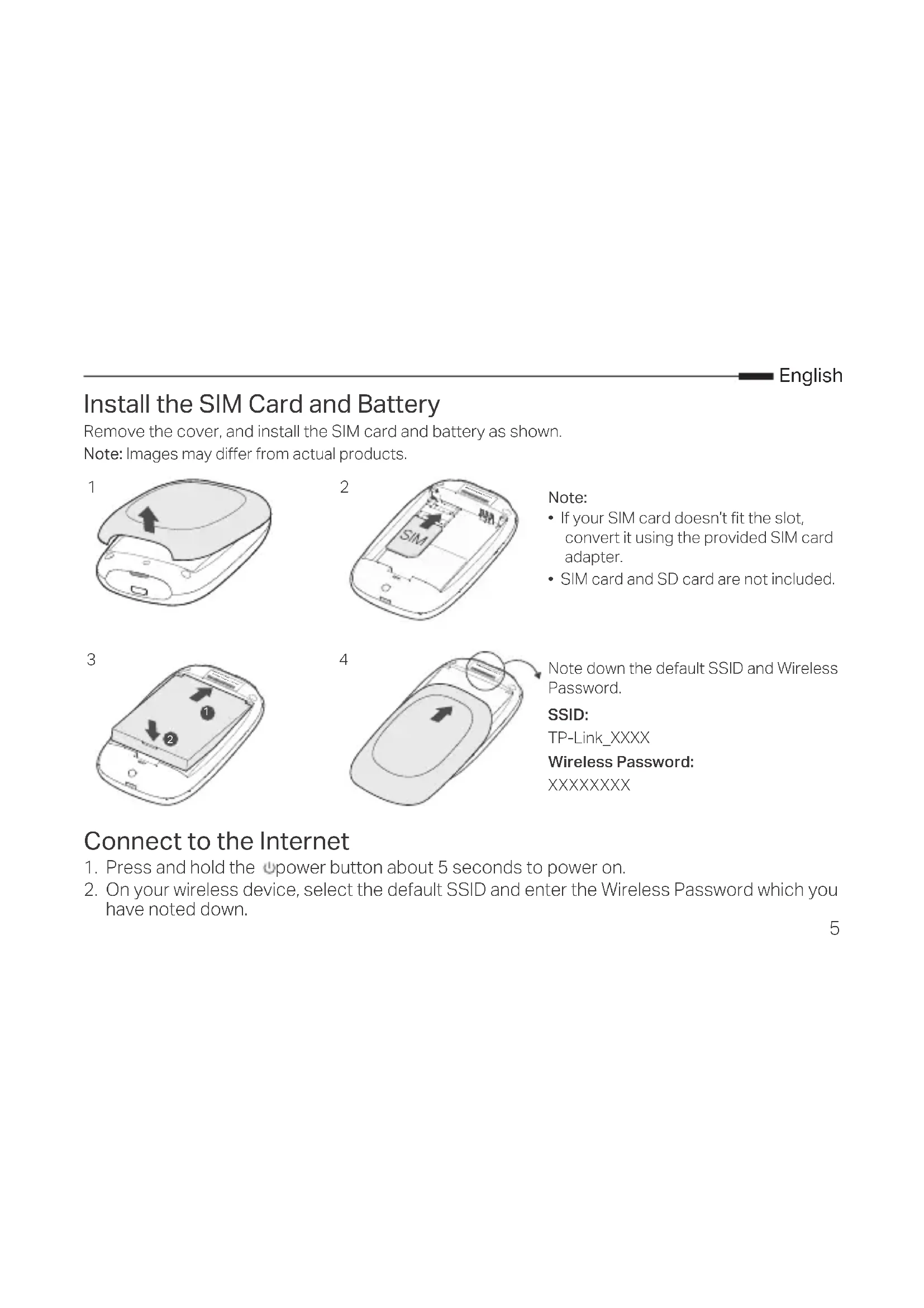 - SIM card and SD card are not included. Note down the default SSID and Wireless Password. SSID: TP-Link_XXXX Wireless Password: XXXXXXXX