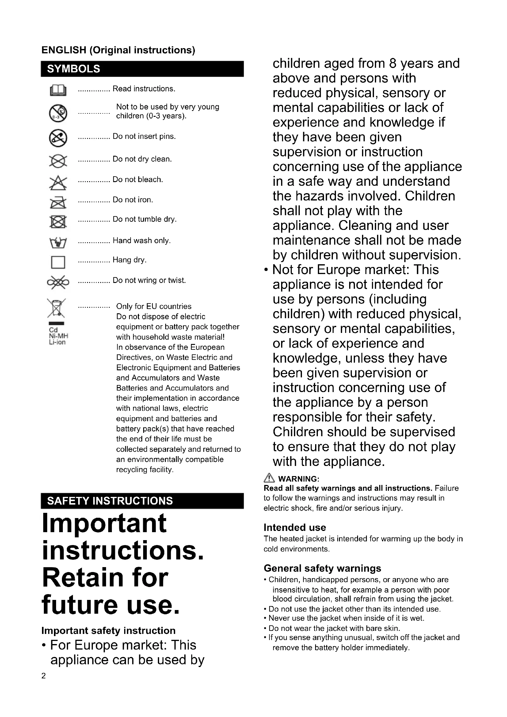 - If you sense anything unusual, switch off the jacket and remove the battery holder immediately. SYMBOLS ............... Read instructions.