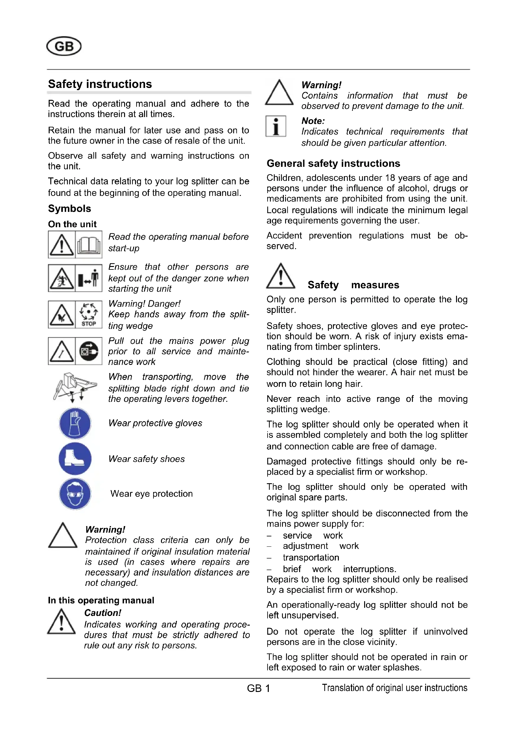 Warning! Protection class criteria can only be maintained if original insulation material is used (in cases where repairs are necessary) and insulation distances are not changed. In this operating manual Caution! Indicates working and operating proce- dures that must be strictly adhered to rule out any risk to persons. Warning! Contains information that must be observed to prevent damage to the unit. Note: Indicates technical requirements that should be given particular attention. General safety instructions Children, adolescents under 18 years of age and persons under the influence of alcohol, drugs or medicaments are prohibited from using the unit. Local regulations will indicate the minimum legal age requirements governing the user. Accident prevention regulations must be ob- served. Safety measures Only one person is permitted to operate the log splitter. Safety shoes, protective gloves and eye protec- tion should be worn. A risk of injury exists ema- nating from timber splinters. Clothing should be practical (close fitting) and should not hinder the wearer. A hair net must be worn to retain long hair. Never reach into active range of the moving splitting wedge. The log splitter should only be operated when it is assembled completely and both the log splitter and connection cable are free of damage. Damaged protective fittings should only be re- placed by a specialist firm or workshop. The log splitter should only be operated with original spare parts. The log splitter should be disconnected from the mains power supply for: − service work − adjustment work − transportation − brief work interruptions. Repairs to the log splitter should only be realised by a specialist firm or workshop. An operationally-ready log splitter should not be left unsupervised. Do not operate the log splitter if uninvolved persons are in the close vicinity. The log splitter should not be operated in rain or left exposed to rain or water splashes. Translation of original user instructionsLog splitter GB 2 There is a risk emanating from electrical current. No other persons should be present within the working area of the log splitter. Special heed should be paid to children and animals. The user of the unit bears responsibility for accidents involving other persons or their prop- erty. The working area should be kept free of timber pieces and other objects – risk of stum- bling. Safety equipment Motor circuit breaker The motor circuit breaker switches the motor off in the event of overloading of the log splitter. The motor circuit breaker function should not be deactivated. Proceed as follows if the motor circuit breaker deactivates the log splitter: