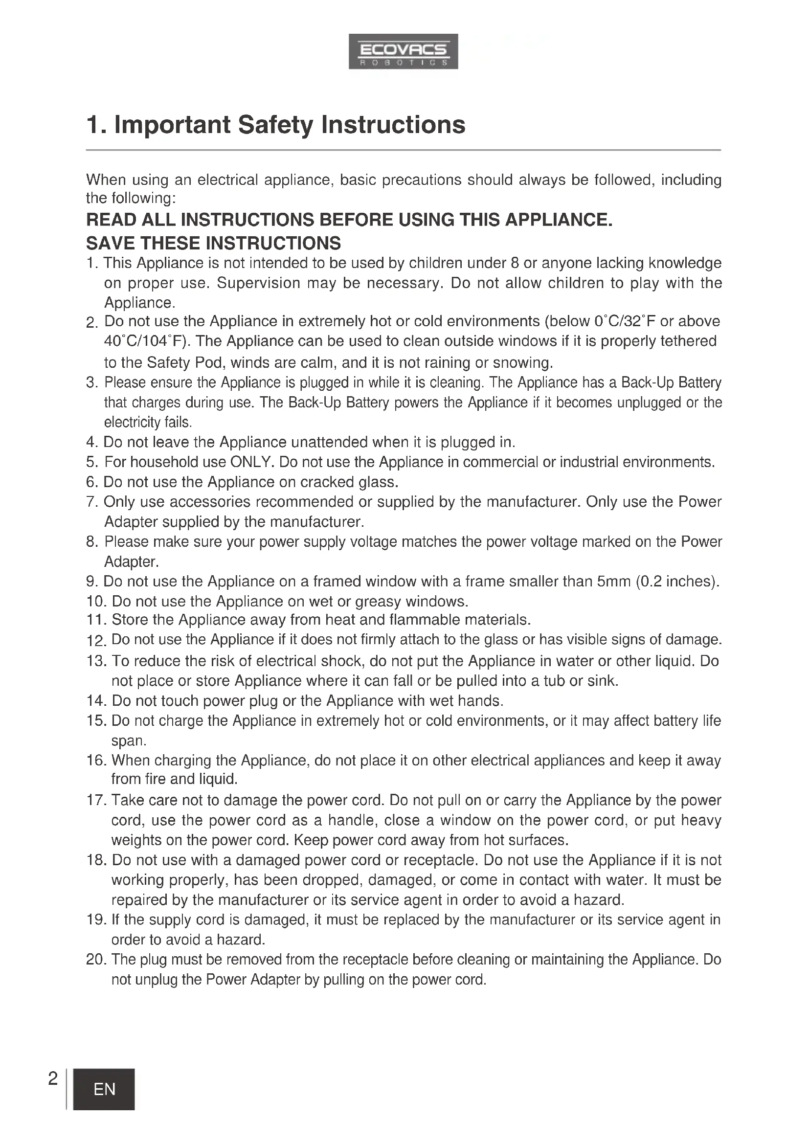 The Appliance must be used in accordance with the directions in this Instruction Manual. Ecovacs Robotics cannot be held liable or responsible for any damages or injuries caused by improper use.4