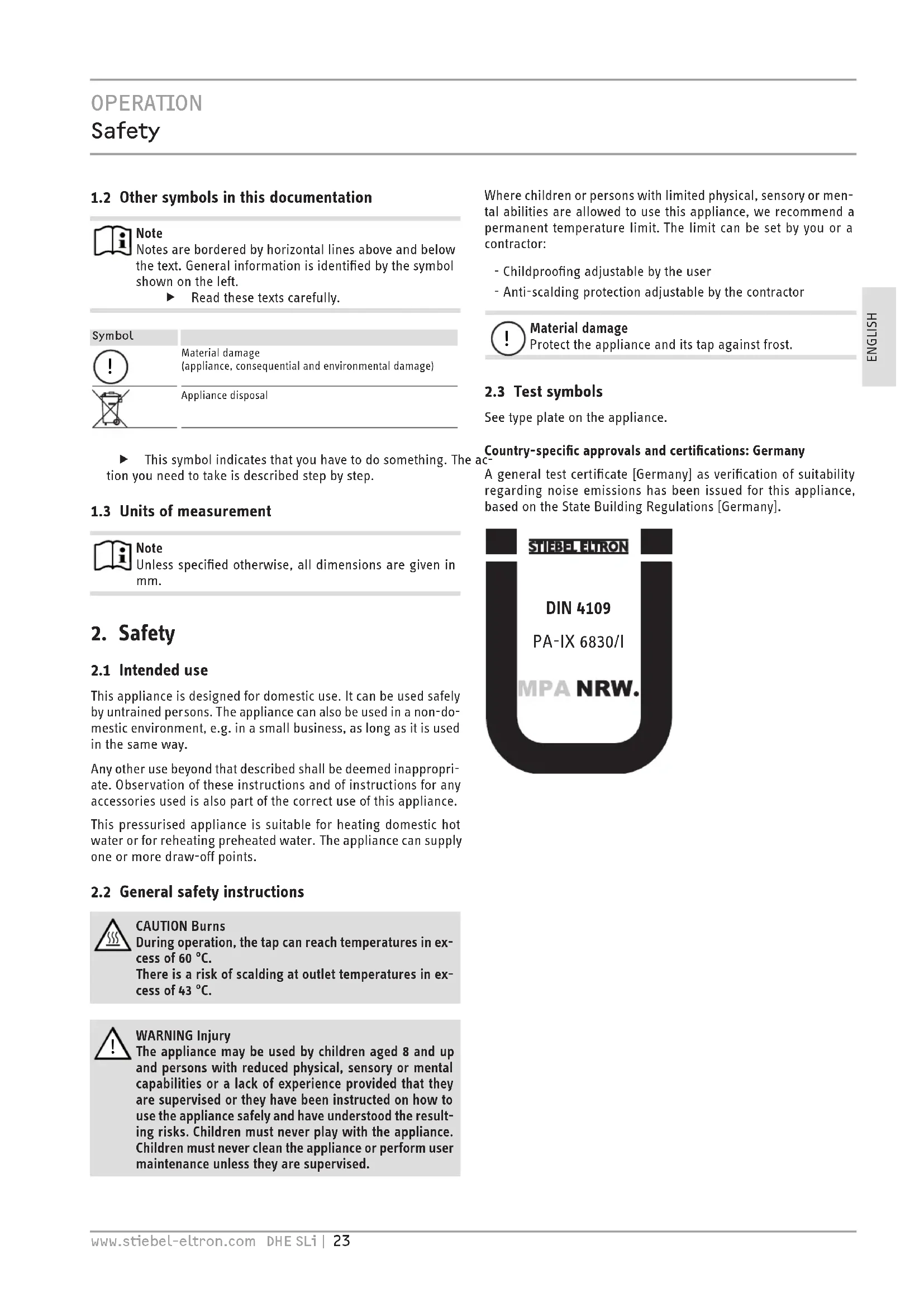 USER MANUAL DHE 21 SLi STIEBEL ELTRON