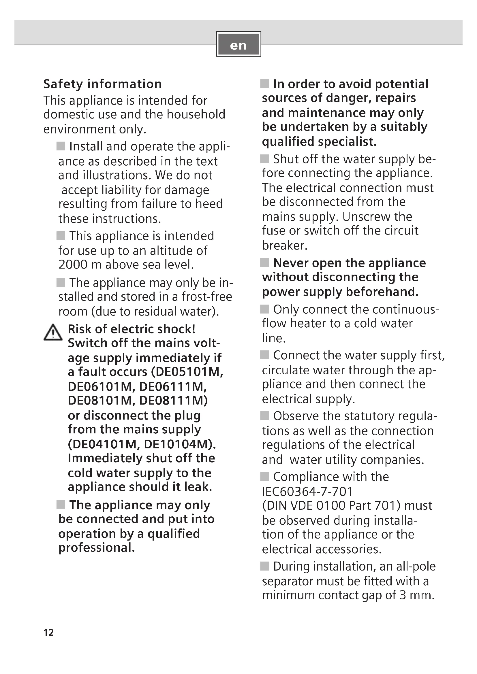 Safety information This appliance is intended for domestic use and the household environment only. ■ Install and operate the appli- ance as described in the text and illustrations. We do not accept liability for damage resulting from failure to heed these instructions. ■ This appliance is intended for use up to an altitude of 2000 m above sea level. ■ The appliance may only be in- stalled and stored in a frost-free room (due to residual water). Risk of electric shock! Switch off the mains volt- age supply immediately if a fault occurs (DE05101M, DE06101M, DE06111M, DE08101M, DE08111M) or disconnect the plug from the mains supply (DE04101M, DE10104M). Immediately shut off the cold water supply to the appliance should it leak. ■ The appliance may only be connected and put into operation by a qualified professional. ■ In order to avoid potential sources of danger, repairs and maintenance may only be undertaken by a suitably qualified specialist. ■ Shut off the water supply be- fore connecting the appliance. The electrical connection must be disconnected from the mains supply. Unscrew the fuse or switch off the circuit breaker. ■ Never open the appliance without disconnecting the power supply beforehand. ■ Only connect the continuous- flow heater to a cold water line. ■ Connect the water supply first, circulate water through the ap- pliance and then connect the electrical supply. ■ Observe the statutory regula- tions as well as the connection regulations of the electrical and water utility companies. ■ Compliance with the