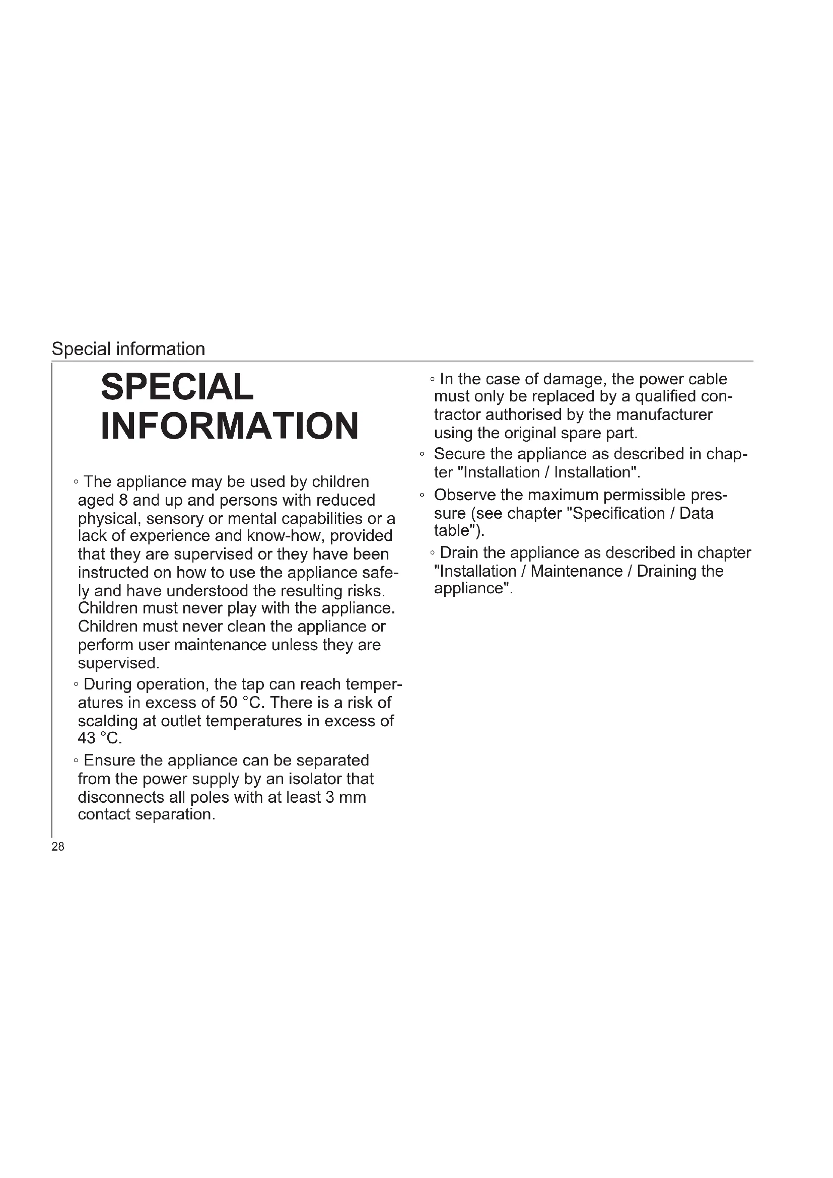 maintenance » Never use abrasive or corrosive cleaning agents. A damp cloth is sufcient for cleaning the appliance. » Check the taps/valves regularly. Limescale deposits at the spouts can be removed using commercially available descaling agents. » Have the electrical safety of the appliance regularly checked by an electrician. » Regularly descale or replace the special aerator (see chapter "Appliance description / Accessories").