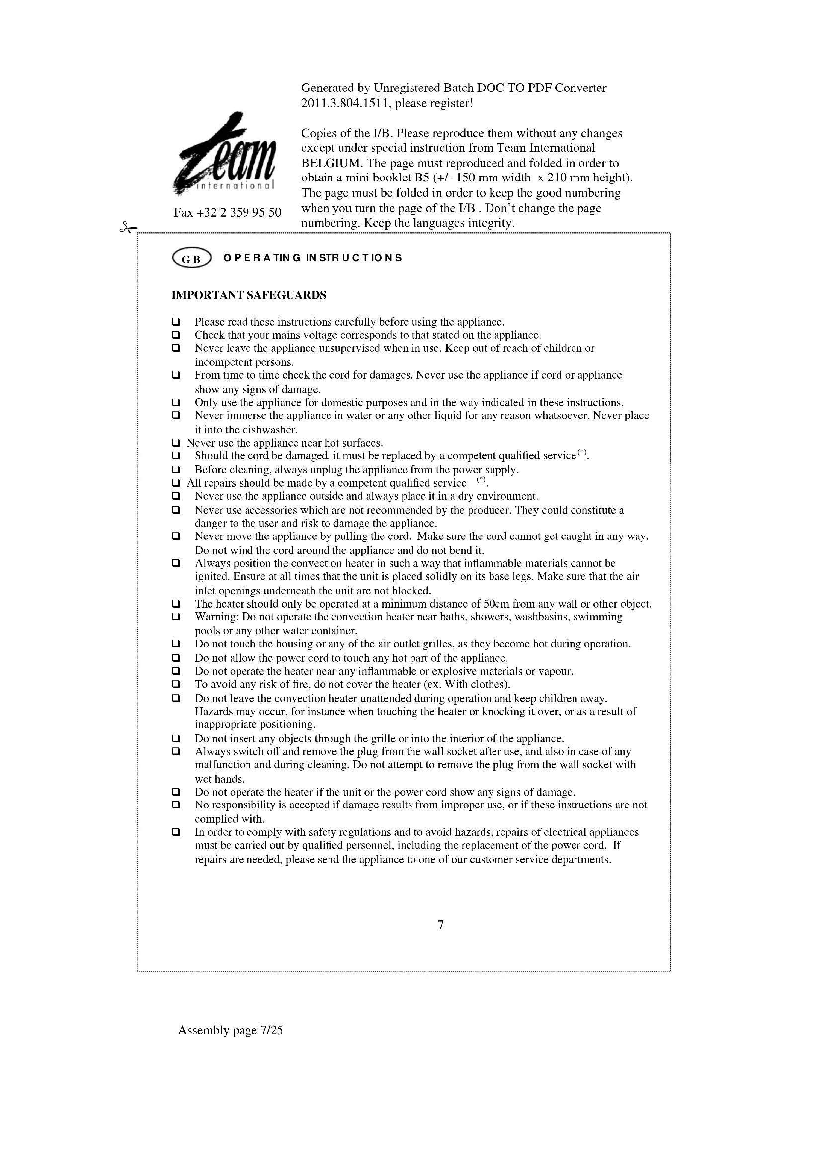 pools or any other water container. Do not touch the housing or any of the air outlet grilles, as they become hot during operation. Do not allow the power cord to touch any hot part of the appliance. Do not operate the heater near any inflammable or explosive materials or vapour. To avoid any risk of fire, do not cover the heater (ex. With clothes). Do not leave the convection heater unattended during operation and keep children away. Hazards may occur, for instance when touching the heater or knocking it over, or as a result of inappropriate positioning. Do not insert any objects through the grille or into the interior of the appliance. Always switch off and remove the plug from the wall socket after use, and also in case of any malfunction and during cleaning. Do not attempt to remove the plug from the wall socket with wet hands. Do not operate the heater if the unit or the power cord show any signs of damage. No responsibility is accepted if damage results from improper use, or if these instructions are not complied with. In order to comply with safety regulations and to avoid hazards, repairs of electrical appliances must be carried out by qualified personnel, including the replacement of the power cord. If repairs are needed, please send the appliance to one of our customer service departments.Generated by Unregistered Batch DOC TO PDF Converter 2011.3.804.1511, please register! Copies of the I/B. Please reproduce them without any changes except under special instruction from Team International BELGIUM. The page must reproduced and folded in order to obtain a mini booklet B5 (+/- 150 mm width x 210 mm height). The page must be folded in order to keep the good numbering when you turn the page of the I/B . Don’t change the page numbering. Keep the languages integrity.