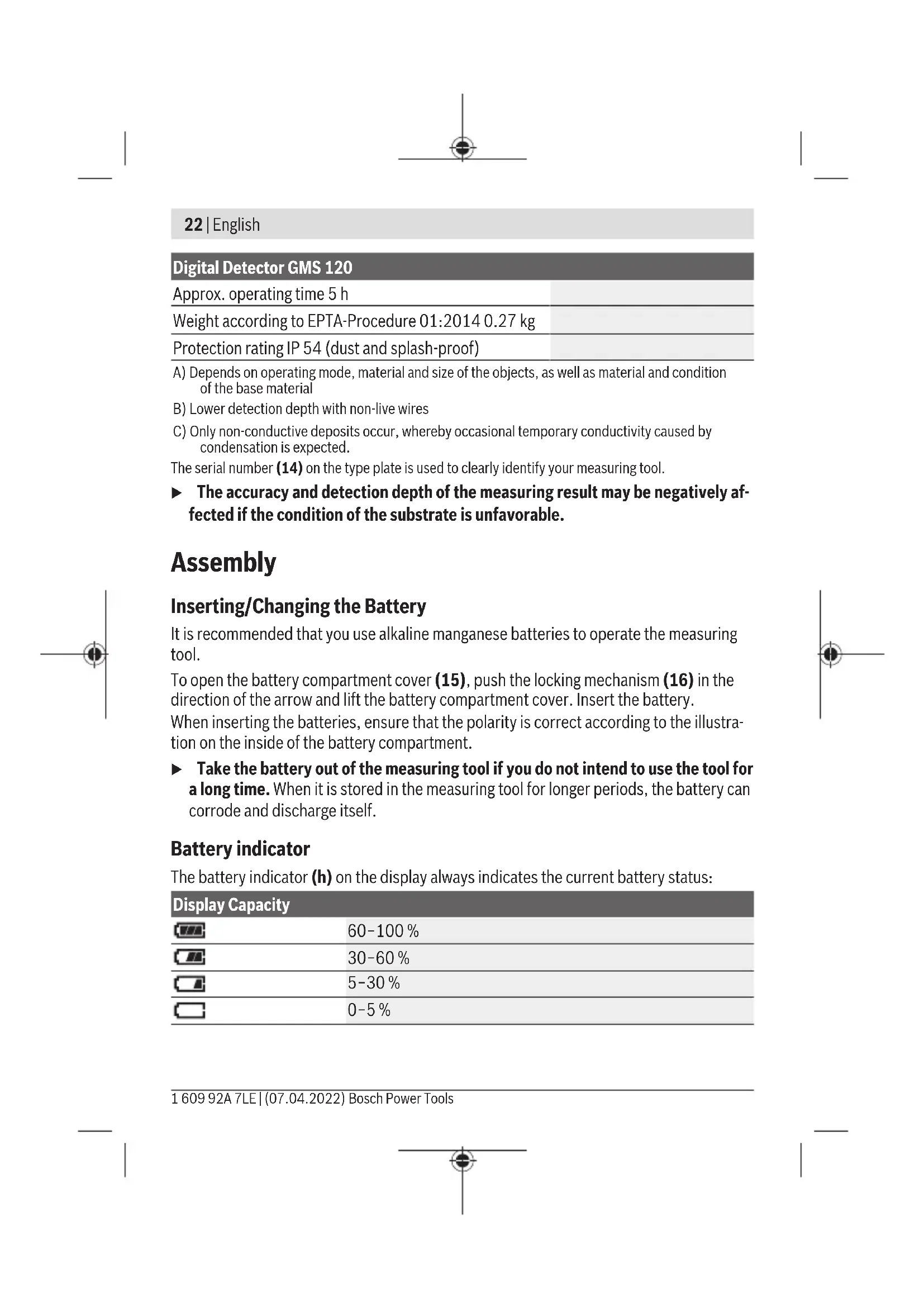 Battery 1×9V6LR61 Bosch Power Tools 1 609 92A 7LE | (07.04.2022)22 | English Digital Detector GMS 120 Approx. operating time 5h Weight according to EPTA-Procedure01:2014 0.27kg Protection rating IP54 (dust and splash-proof) A) Depends on operating mode, material and size of the objects, as well as material and condition of the base material B) Lower detection depth with non-live wires C) Only non-conductive deposits occur, whereby occasional temporary conductivity caused by condensation is expected. The serial number(14) on the type plate is used to clearly identify your measuring tool. u The accuracy and detection depth of the measuring result may be negatively af- fected if the condition of the substrate is unfavorable. Assembly Inserting/Changing the Battery It is recommended that you use alkaline manganese batteries to operate the measuring tool. To open the battery compartment cover(15), push the locking mechanism(16) in the direction of the arrow and lift the battery compartment cover. Insert the battery. When inserting the batteries, ensure that the polarity is correct according to the illustra- tion on the inside of the battery compartment. u Take the battery out of the measuring tool if you do not intend to use the tool for a long time. When it is stored in the measuring tool for longer periods, the battery can corrode and discharge itself. Battery indicator The battery indicator(h) on the display always indicates the current battery status: Display Capacity 60−100% 30−60% 5−30% 0−5% 1 609 92A 7LE | (07.04.2022) Bosch Power ToolsEnglish | 23 Operation u Protect the measuring tool from moisture and direct sunlight. u Do not expose the measuring tool to any extreme temperatures or variations in temperature. In case of large variations in temperature, leave the measuring tool to adjust to the ambient temperature before switching it on. The accuracy of the measuring tool and the functionality of the display may be compromised if exposed to extreme temperatures or variations in temperature. u Avoid hard knocks to the measuring tool or dropping it. After severe external influ- ences and in the event of abnormalities in the functionality, you should have the measuring tool checked by an authorised Bosch after-sales service agent. u Certain ambient conditions fundamentally impair the measuring results. These include, e.g. the proximity of devices that generate strong electric, magnetic or electromagnetic fields, moisture, metal building materials, foil-laminated insula- tion materials or conductive wallpaper or tiles. Therefore, also refer to other in- formation sources (e.g. construction plans) before drilling, sawing or routing into walls, ceilings or floors. u Hold the measuring tool by the intended gripping surface (8) only, so as not to influence the measurement. u Do not attach any stickers or labels to the sensor area(13) on the rear of the measuring tool. Metal labels in particular will affect measuring results. Do not wear gloves when taking measurements and make sure that you are properly earthed. If you are not properly earthed, the identification of live wires may be impaired. When taking measurements, avoid devices that emit strong elec- tric, magnetic or electromagnetic fields. If possible, deactivate all tools whose radiation could interfere with the measurement and switch off the corresponding functions or tools. Starting Operation Switching on/off u Before switching on the measuring tool, ensure that the sensor area(13) is dry. If necessary, use a cloth to dry the measuring tool. u If the measuring tool has been exposed to a significant change in temperature, leave it to adjust to the ambient temperature before switching it on. To switch on the measuring tool, press the on/off button(5). Bosch Power Tools 1 609 92A 7LE | (07.04.2022)24 | English To switch off the measuring tool, press the on/off button(5) again. If no button on the measuring tool is pressed for approx. 5mins, and no objects are de- tected, the measuring tool will automatically switch itself off to preserve battery life. Switching the display illumination on and off The display illumination can be switched on or off with the display illumination button(6). Switching audio signal on/off The audio signal can be switched on/off with the audio signal button(7). When the audio signal is switched off, the audio signal indicator(a) appears on the display. How it works (seefigureB) The measuring tool checks the base material of the sensor area(13) in the measurement direction A up to the maximum detection depth. Objects that are different from the ma- terial of the wall are detected. Move the measuring tool in a straight line in direction B over the wall. Always move the measuring tool over the base material applying light pressure, without lifting it off or changing the pressure. During the measurement, the contact pads(12) must always remain in contact with the surface. Measuring process Place the measuring tool on the surface to be examined and move it in direction B. – When the measuring tool approaches an object, the amplitude in the measuring indicator(i) increases and the light-up ring(1) lights up yellow. – The amplitude decreases when the measuring tool moves away from the object. – Above the centre of an object, the measuring indicator will indicate maximum amp- litude; the light-up ring(1) will light up red and an audio signal will sound. For small or deep-lying objects, the light-up ring(1) can continue to light up yellow without the audio signal sounding. u Wide objects are not indicated by the light-up ring or the audio signal throughout their complete width. In order to locate an object more precisely, move the measuring tool repeatedly (3×) back and forth over the object. The fine scale(j) is activated automatically in all operat- ing modes. The fine scale indicates a full amplitude when the object is below the centre of the sensor or when the maximum amplitude of the measuring in