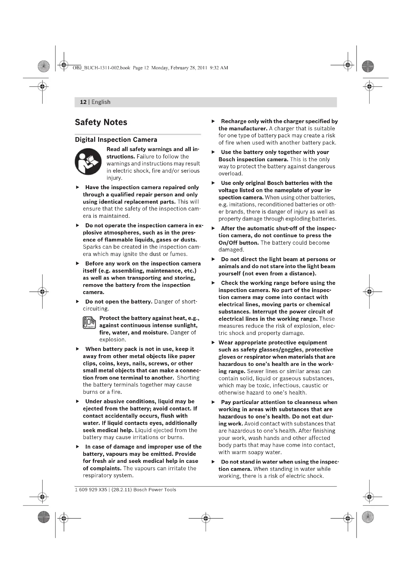Wear appropriate protective equipment such as safety glasses/goggles, protective gloves or respirator when materials that are hazardous to one’s health are in the work- ing range. Sewer lines or similar areas can contain solid, liquid or gaseous substances, which may be toxic, infectious, caustic or otherwise hazard to one’s health. f Pay particular attention to cleanness when working in areas with substances that are hazardous to one’s health. Do not eat dur- ing work. Avoid contact with substances that are hazardous to one’s health. After finishing your work, wash hands and other affected body parts that may have come into contact, with warm soapy water. f Do not stand in water when using the inspec- tion camera. When standing in water while working, there is a risk of electric shock. OBJ_BUCH-1311-002.book Page 12 Monday, February 28, 2011 9:32 AMEnglish | 13 Bosch Power Tools 1 609 929 X35 | (28.2.11) Magnet Keep the magnet 15 away from cardiac pacemakers. The magnet generates a field that can impair the function of cardiac pace- makers. f Keep the magnet 15 away from magnetic data medium and magnetically-sensitive equipment. The effect of the magnetic can lead to irreversible data loss. Product Description and Specifications While reading the operating instructions, unfold the fold-out page with the illustration of the in- spection camera and leave it open. Intended Use The digital inspection camera is suitable for in- specting hard to reach locations or dark areas. After mounting the provided accessories to the camera head, it is also suitable for moving and removing small and light objects (e.g., small screws). The digital inspection camera may not be used for medicinal purposes. It is also not suitable for repairing pipe clogs or pulling in cables. Product Features The numbering of the product features refers to the illustration of the inspection camera on the graphics page. 1 Hand unit 2 Increase-brightness button “+” 3 On/Off button 4 Reduce-brightness button “–” 5 Display 6 Camera cable 7 Camera head 8 Camera lens 9 Illumination light in camera head 10 Battery* 11 Battery unlocking button 12 Camera cable, extension* 13 Socket sleeve of camera connection 14 Camera connection 15 Magnet 16 Hook 17 Mirror 18 Video output socket 19 Video cable *Accessories shown or described are not part of the standard delivery scope of the product. A complete overview of accessories can be found in our acces- sories program. Technical Data Digital Inspection Camera GOS 10,8 V-LI Professional Article number 3 601 B41 000 Rated voltage V= 10.8 Operating temperature °C –20...+65 Storage temperature (hand unit without battery) °C –30...+80 Relative humidity %5–95