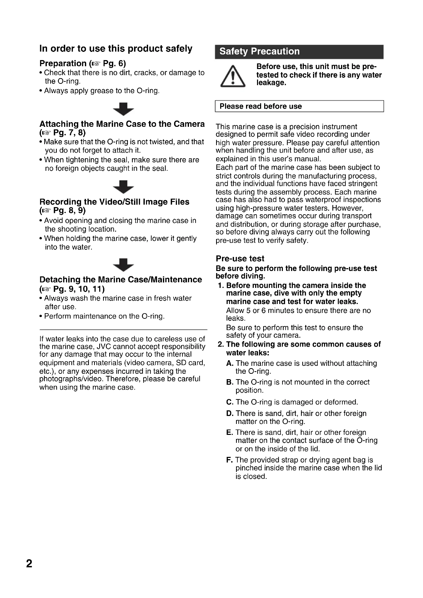 on the marine case every time you use it. The marine case must withstand water pressure with use. Repeated exposure to pressure eventually leads to material fatigue, which may result in damage of the marine case. Every time you use the marine case, check in advance that there are no scratches or cracks. If you frequently use the marine case, be sure to ask for maintenance at the store of purchase. (There is a charge for maintenance.) To protect your camera and ensure optimum use, keep the examples listed above in mind when using the marine case. JVC accepts no responsibility for water leakage or damage to anything inside the marine case (camera, SD card, etc.) due to careless usage of this product. Be sure to follow correct procedures when using the marine case.