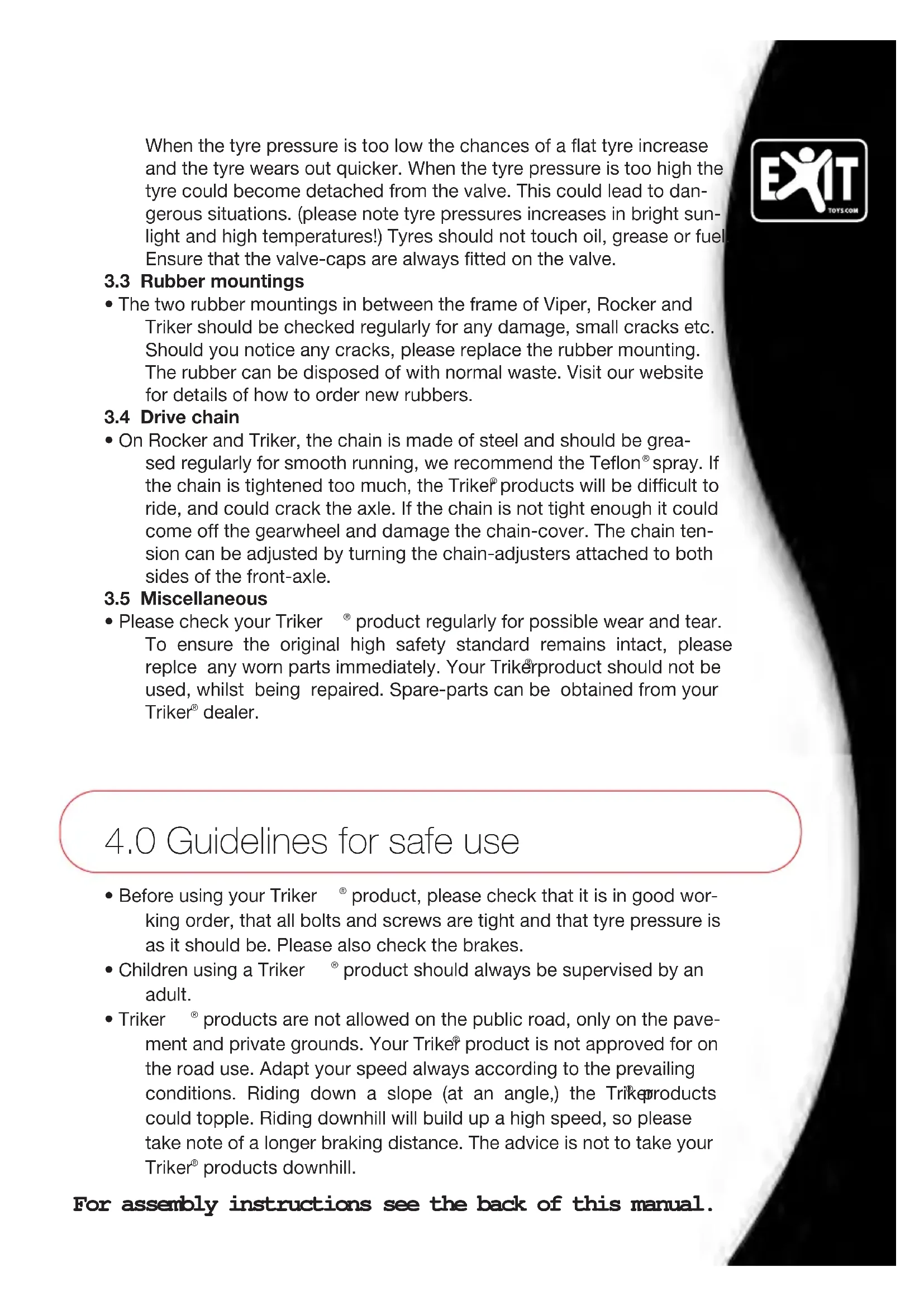 - Please check your Triker ^® product regularly for possible wear and tear. To ensure the original high safety standard remains intact, please replace any worn parts immediately. Your Triker ^® product should not be used, whilst being repaired. Spare-parts can be obtained from your Triker ^® dealer.