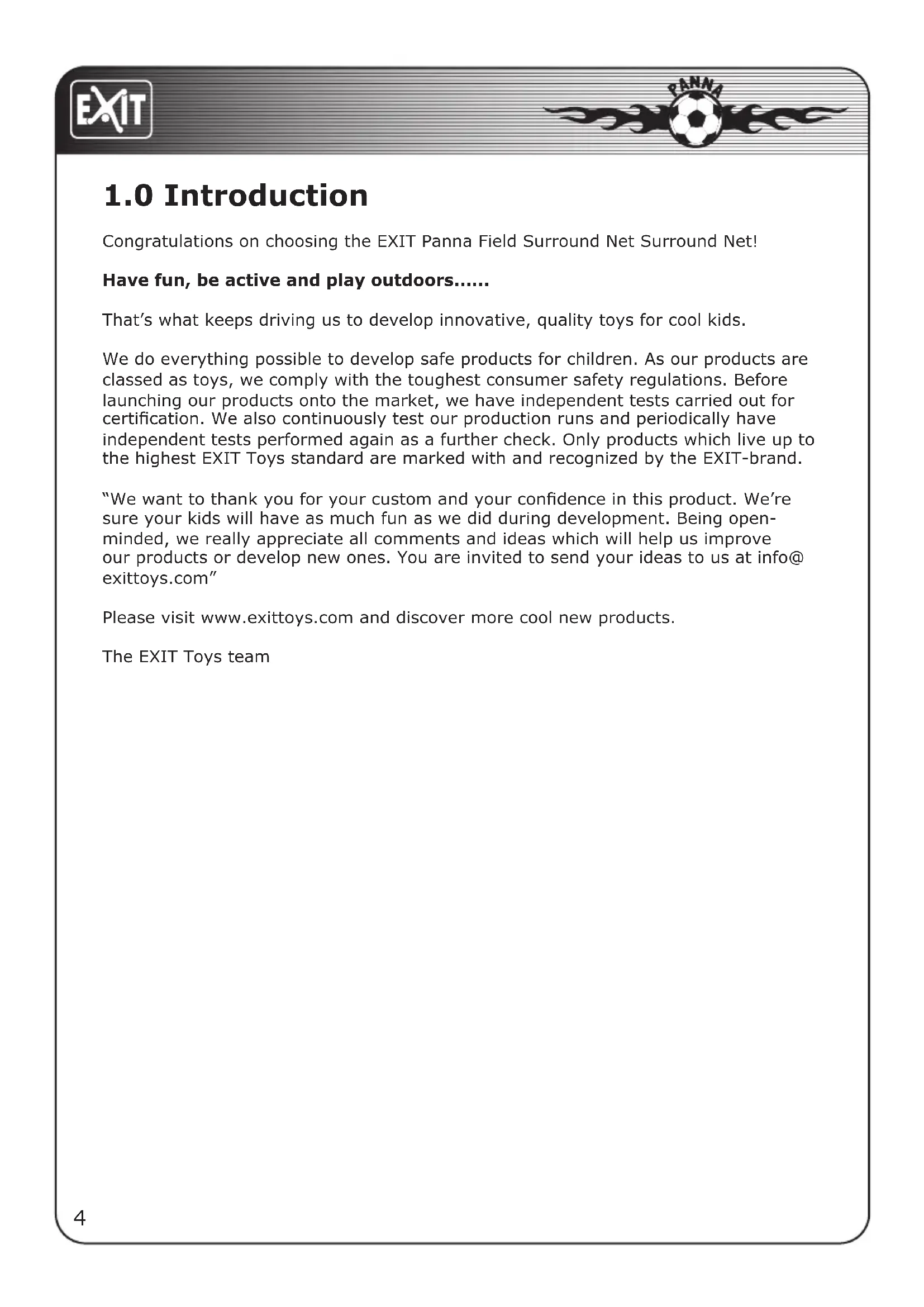 "We want to thank you for your custom and your confidence in this product. We're sure your kids will have as much fun as we did during development. Being open-minded, we really appreciate all comments and ideas which will help us improve our products or develop new ones. You are invited to send your ideas to us at info@exittoys.com"