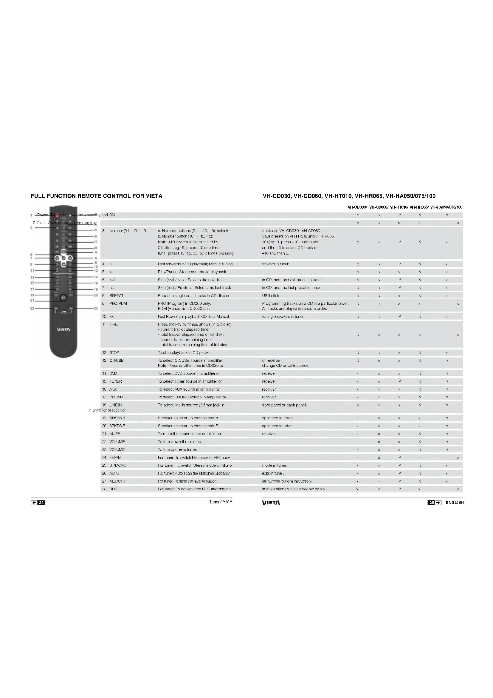| 25 | ST/MONO | For tuner: To switch Storco mode or Mono | mode in tuner. | × | × | √ | √ | × |