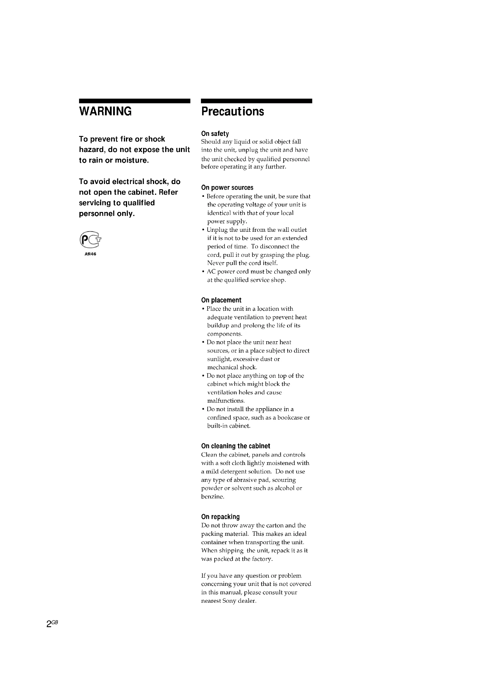 WARNING To prevent fire or shock hazard, do not expose the unit to rain or moisture. To avoid electrical shock, do not open the cabinet. Refer servicing to qualified personnel only. Precautions On safety Should any liquid or solid object fall into the unit, unplug the unit and have the unit checked by qualified personnel before operating it any further. On power sources