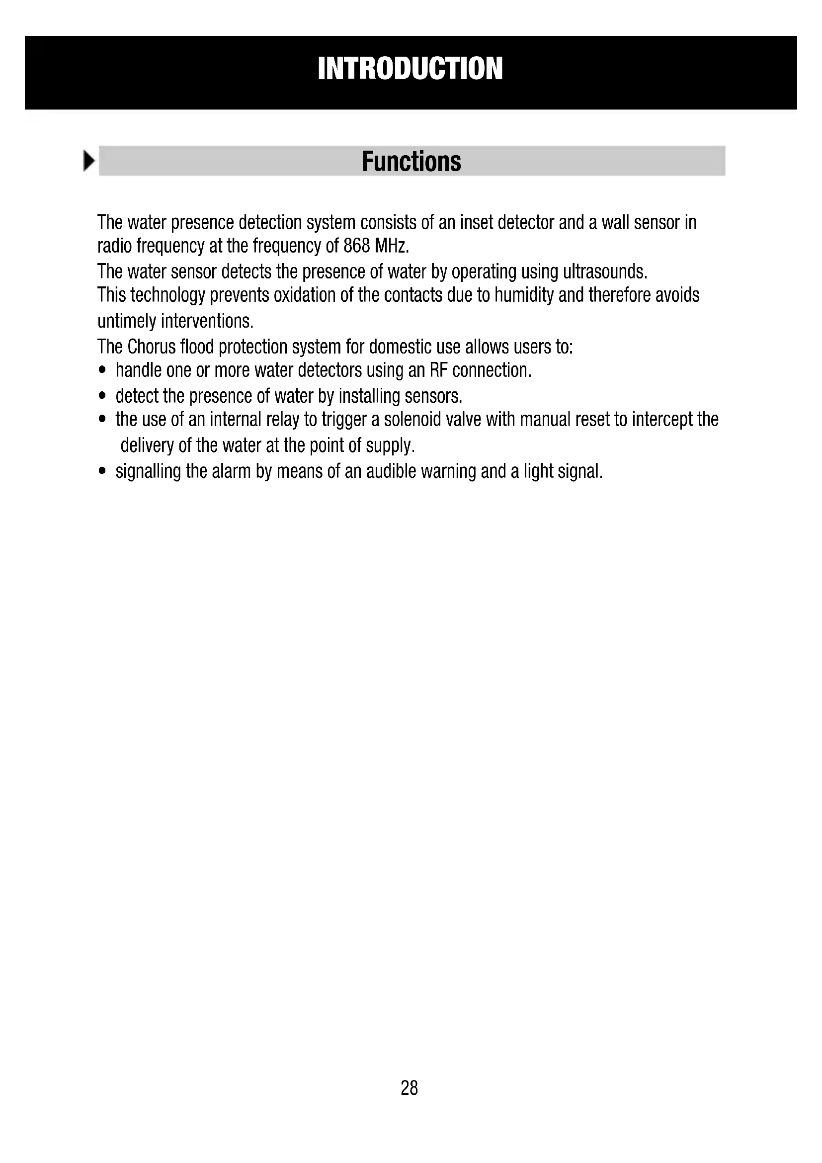 The water presence detection system consists of an inset detector and a wall sensor in radio frequency at the frequency of 868 MHz.