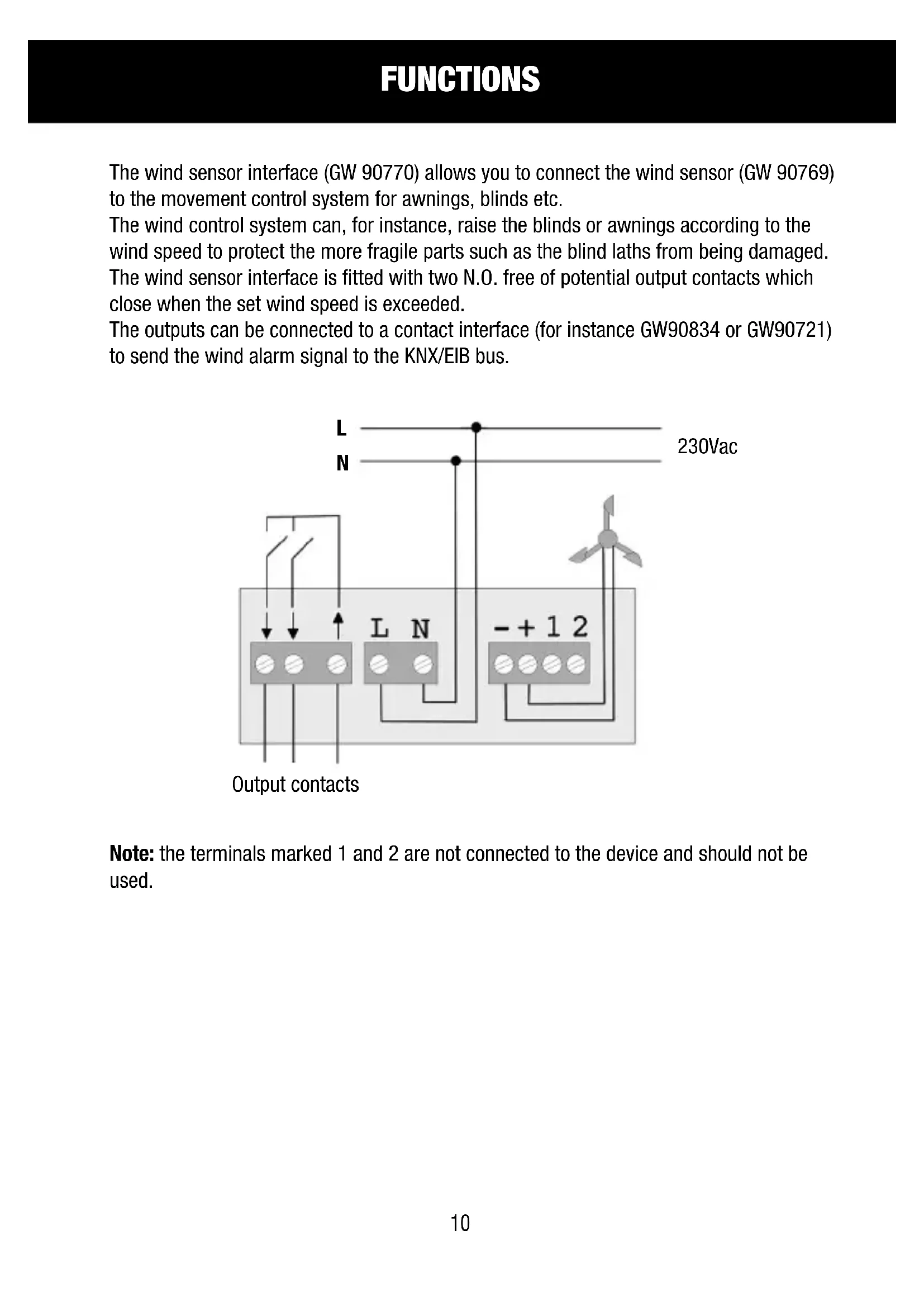 L N 230Vac Output contacts L N - + 1 2Note: the terminals marked 1 and 2 are not connected to the device and should not be used.