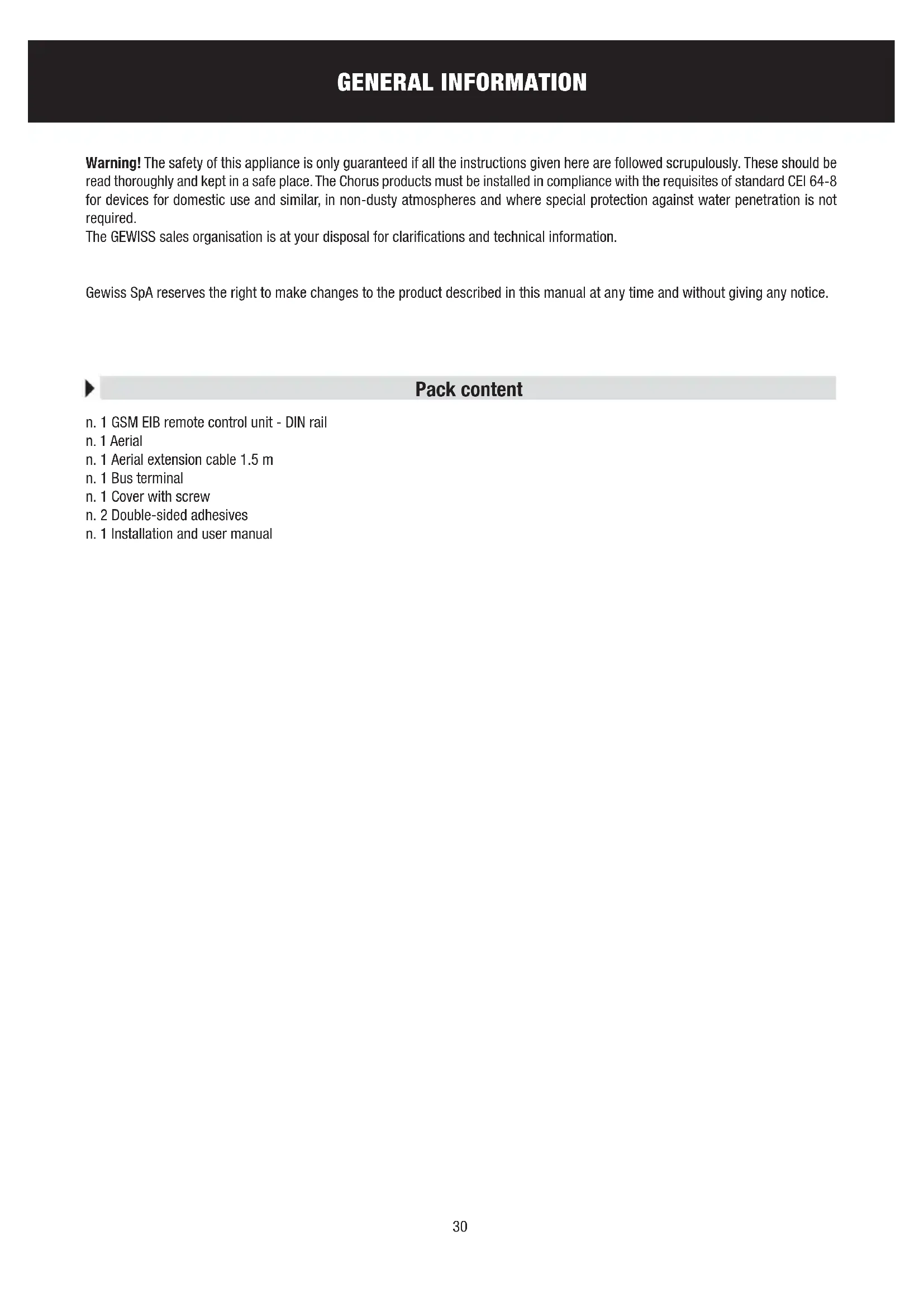 Warning! The safety of this appliance is only guaranteed if all the instructions given here are followed scrupulously. These should be read thoroughly and kept in a safe place. The Chorus products must be installed in compliance with the requisites of standard CEI 64-8 for devices for domestic use and similar, in non-dusty atmospheres and where special protection against water penetration is not required.