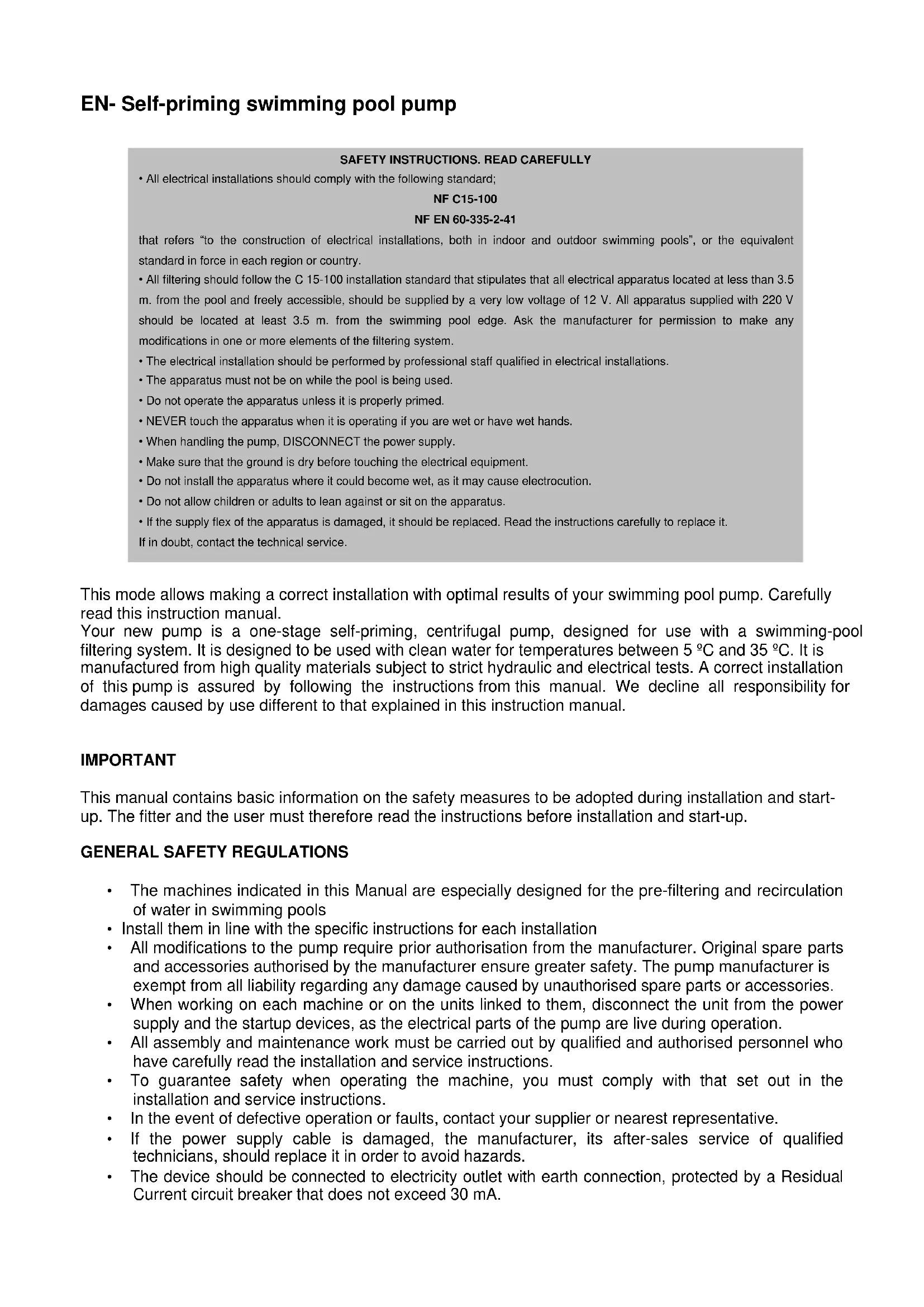 Your new pump is a one-stage self-priming, centrifugal pump, designed for use with a swimming-pool filtering system. It is designed to be used with clean water for temperatures between 5 °C and 35 °C. It is manufactured from high quality materials subject to strict hydraulic and electrical tests. A correct installation of this pump is assured by following the instructions from this manual. We decline all responsibility for damages caused by use different to that explained in this instruction manual.