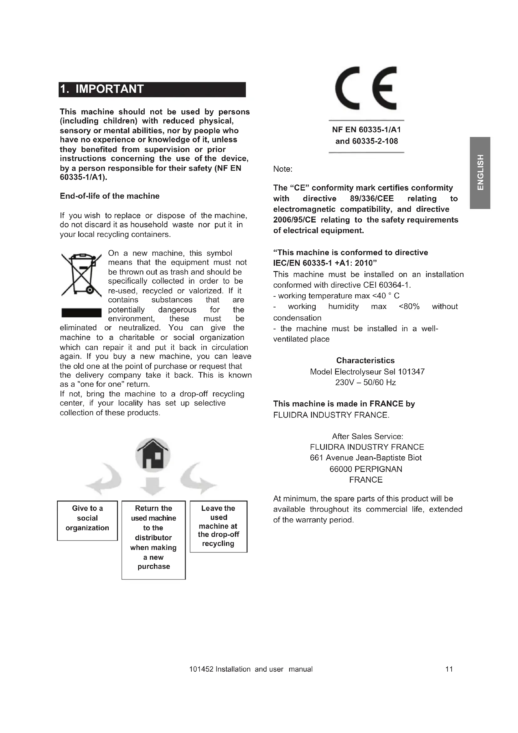 661 Avenue Jean-Baptiste Biot 66000 PERPIGNAN FRANCE At minimum, the spare parts of this product will be available throughout its commercial life, extended of the warranty period. Give to a social organization Return the used machine to the distributor when making a new purchase
