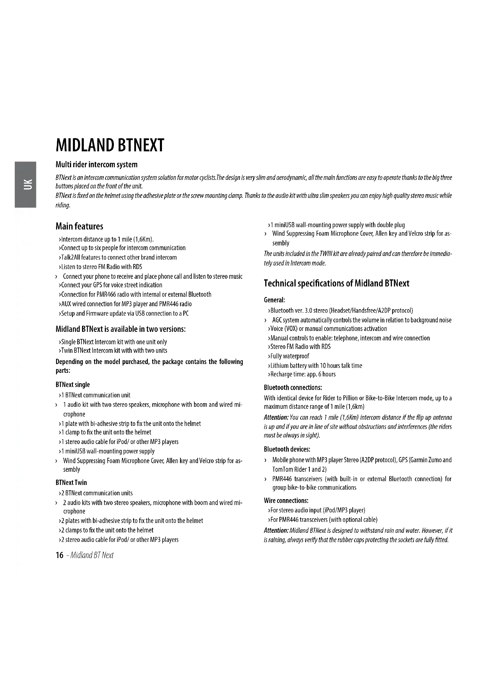 MIDLAND BTNEXT Multi rider intercom system BTNext is an intercom communication system solution for motor cyclists.The design is very slim and aerodynamic, all the main functions are easy to operate thanks to the big three buttons placed on the front of the unit. BTNext is xed on the helmet using the adhesive plate or the screw mounting clamp. Thanks to the audio kit with ultra slim speakers you can enjoy high quality stereo music while riding. Main features › Intercom distance up to 1 mile (1,6Km). › Connect up to six people for intercom communication › Talk2All features to connect other brand intercom › Listen to stereo FM Radio with RDS › Connect your phone to receive and place phone call and listen to stereo music › Connect your GPS for voice street indication › Connection for PMR466 radio with internal or external Bluetooth › AUX wired connection for MP3 player and PMR446 radio › Setup and Firmware update via USB connection to a PC Midland BTNext is available in two versions: › Single BTNext Intercom kit with one unit only › Twin BTNext Intercom kit with with two units Depending on the model purchased, the package contains the following parts:BTNext single › 1 BTNext communication unit › 1 audio kit with two stereo speakers, microphone with boom and wired mi- crophone › 1 plate with bi-adhesive strip to x the unit onto the helmet › 1 clamp to x the unit onto the helmet › 1 stereo audio cable for iPod/ or other MP3 players › 1 miniUSB wall-mounting power supply › Wind Suppressing Foam Microphone Cover, Allen key and Velcro strip for as- semblyBTNext Twin › 2 BTNext communication units › 2 audio kits with two stereo speakers, microphone with boom and wired mi- crophone › 2 plates with bi-adhesive strip to x the unit onto the helmet › 2 clamps to x the unit onto the helmet › 2 stereo audio cable for iPod/ or other MP3 players › 1 miniUSB wall-mounting power supply with double plug › Wind Suppressing Foam Microphone Cover, Allen key and Velcro strip for as- semblyThe units included in the TWIN kit are already paired and can therefore be immedia-tely used in Intercom mode. Technical specifications of Midland BTNext General: › Bluetooth ver. 3.0 stereo (Headset/Handsfree/A2DP protocol) › AGC system automatically controls the volume in relation to background noise › Voice (VOX) or manual communications activation › Manual controls to enable: telephone, intercom and wire connection › Stereo FM Radio with RDS › Fully waterproof › Lithium battery with 10 hours talk time › Recharge time: app. 6 hoursBluetooth connections:With identical device for Rider to Pillion or Bike-to-Bike Intercom mode, up to a maximum distance range of 1 mile (1,6km) Attention: You can reach 1 mile (1,6Km) intercom distance if the ip up antenna is up and if you are in line of site without obstructions and interferences (the riders must be always in sight).Bluetooth devices: › Mobile phone with MP3 player Stereo (A2DP protocol), GPS (Garmin Zumo and TomTom Rider 1 and 2) › PMR446 transceivers (with built-in or external Bluetooth connection) for group bike-to-bike communications Wire connections: › For stereo audio input (iPod/MP3 player) › For PMR446 transceivers (with optional cable)Attention: Midland BTNext is designed to withstand rain and water. However, if it is raining, always verify that the rubber caps protecting the sockets are fully tted.UK Midland BT Next - 17 Charging batteries Attention: Make sure that the unit is fully charged before use. Allow at least 8 hours for a full charge before using the unit for the rst time. Charge the unit by inserting the wall-charger into the charging socket (lift the rubber cover to insert the plug). The red LED on the unit will start ashing when charging begins. Allow the headset to charge until the unit stops ashing or the blue LED turns on. When the charge is complete (the red LED is not ashing), release the headset from the charger. Normally, after the rst time, it takes 6 hours for a full charge. Attention: every time the mini USB recharging plug is inserted (or detached), the device is automatically turned o. To use it while it is in charge, you should turn the device on with the plug already inserted. Unit and fixing system description BT Next description The BTNext has ve buttons on the front; the main three big button are multi functions buttons: the Forward (on the left), the middle button and the Rear (on the right), the two small rounded buttons are the Volume + and Volume -. Description of the wired connections On the bottom of the unit you can nd three wired connection: Charger jack: enables to recharge the unit using a standard miniUSB power supply Audio kit jack: enable to connect an audio kit (stereo headset and microphone) Auxiliary audio jack (AUX) 2.5mm: can be used to connect an audio source, like a stereo iPod/MP3 player or PMR446 transceiver In addition the BTNext has a ip up antenna on the top for maximum distance performance. To lift the antenna, press gently backward and the antenna will automatically lift up. To close the antenna just press it down and be sure to move it back into the closed position. Middle button Volume -Volume + Forward button Backward button Charger jack Audio kit jack Auxiliary audio jack (AUX)18 - Midland BT Next