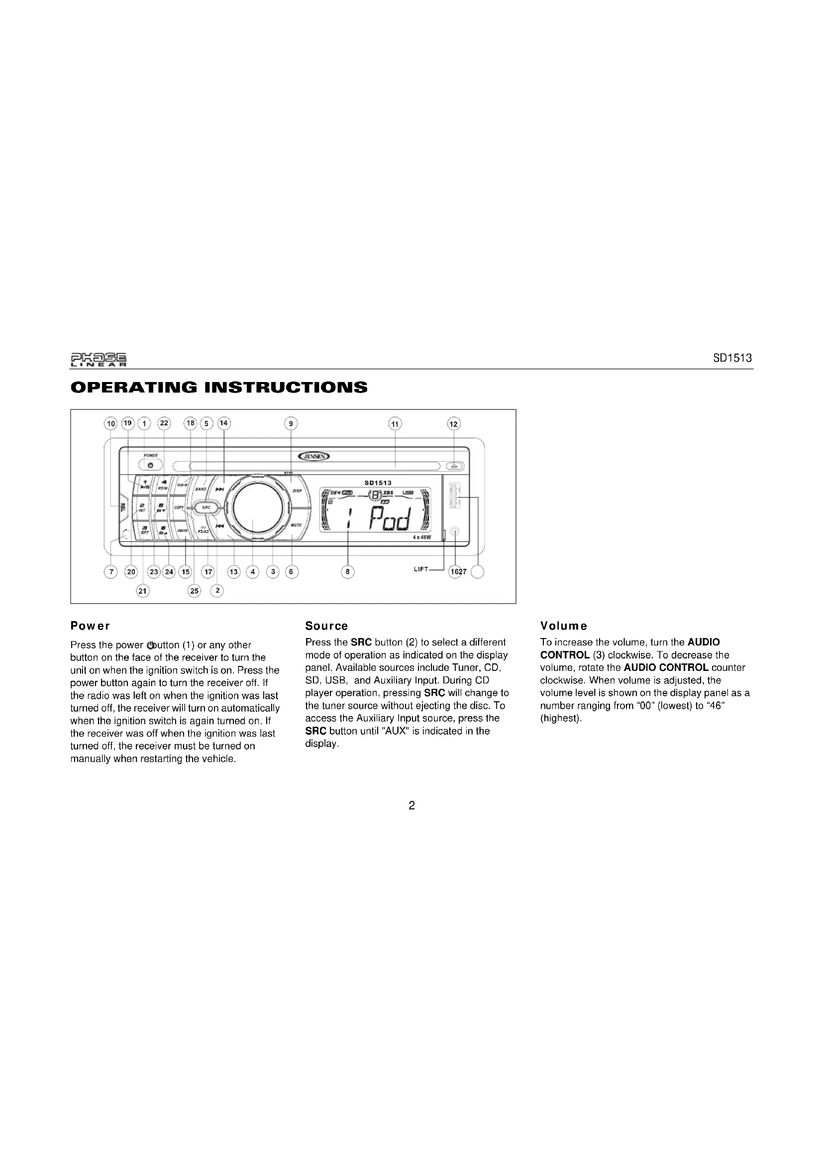 OPERATING INSTRUCTIONS Power Press the power button (1) or any other button on the face of the receiver to turn the unit on when the ignition switch is on. Press the power button again to turn the receiver off. If the radio was left on when the ignition was last turned off, the receiver will turn on automatically when the ignition switch is again turned on. If the receiver was off when the ignition was last turned off, the receiver must be turned on manually when restarting the vehicle. Source Press the SRC button (2) to select a different mode of operation as indicated on the display panel. Available sources include Tuner, CD, SD, USB, and Auxiliary Input. During CD player operation, pressing SRC will change to the tuner source without ejecting the disc. To access the Auxiliary Input source, press the SRC button until "AUX" is indicated in the display. Volume To increase the volume, turn the AUDIO CONTROL (3) clockwise. To decrease the volume, rotate the AUDIO CONTROL counter clockwise. When volume is adjusted, the volume level is shown on the display panel as a number ranging from “00” (lowest) to “46” (highest). SD1513