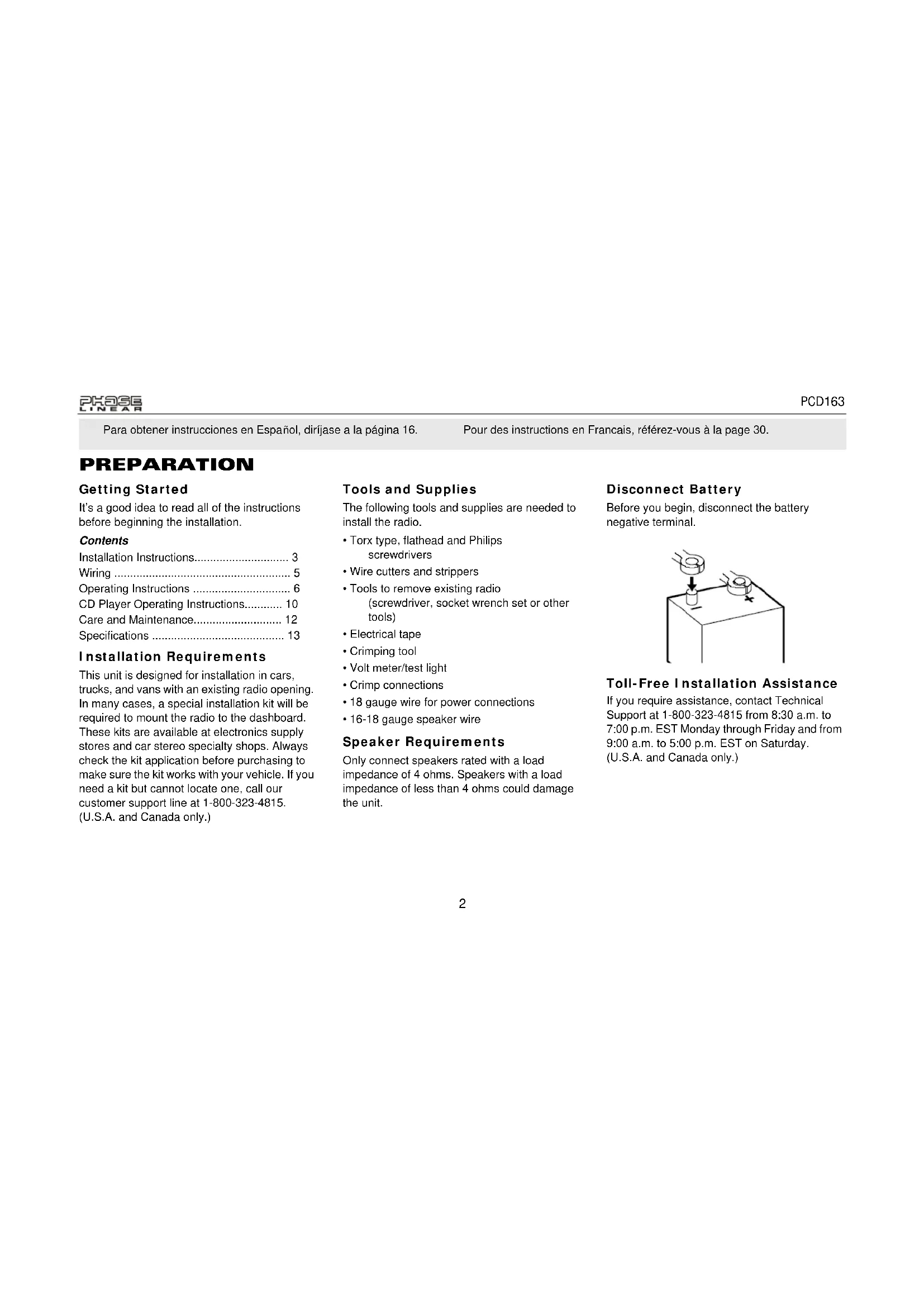 - 16-18 gauge speaker wire Speaker Requirements Only connect speakers rated with a load impedance of 4 ohms. Speakers with a load impedance of less than 4 ohms could damage the unit. Disconnect Battery Before you begin, disconnect the battery negative terminal. Toll-Free Installation Assistance If you require assistance, contact Technical Support at 1-800-323-4815 from 8:30 a.m. to 7:00 p.m. EST Monday through Friday and from 9:00 a.m. to 5:00 p.m. EST on Saturday. (U.S.A. and Canada only.) Pour des instructions en Francais, référez-vous à la page 30. Para obtener instrucciones en Espa ñol, diríjase a la página 16.PCD163