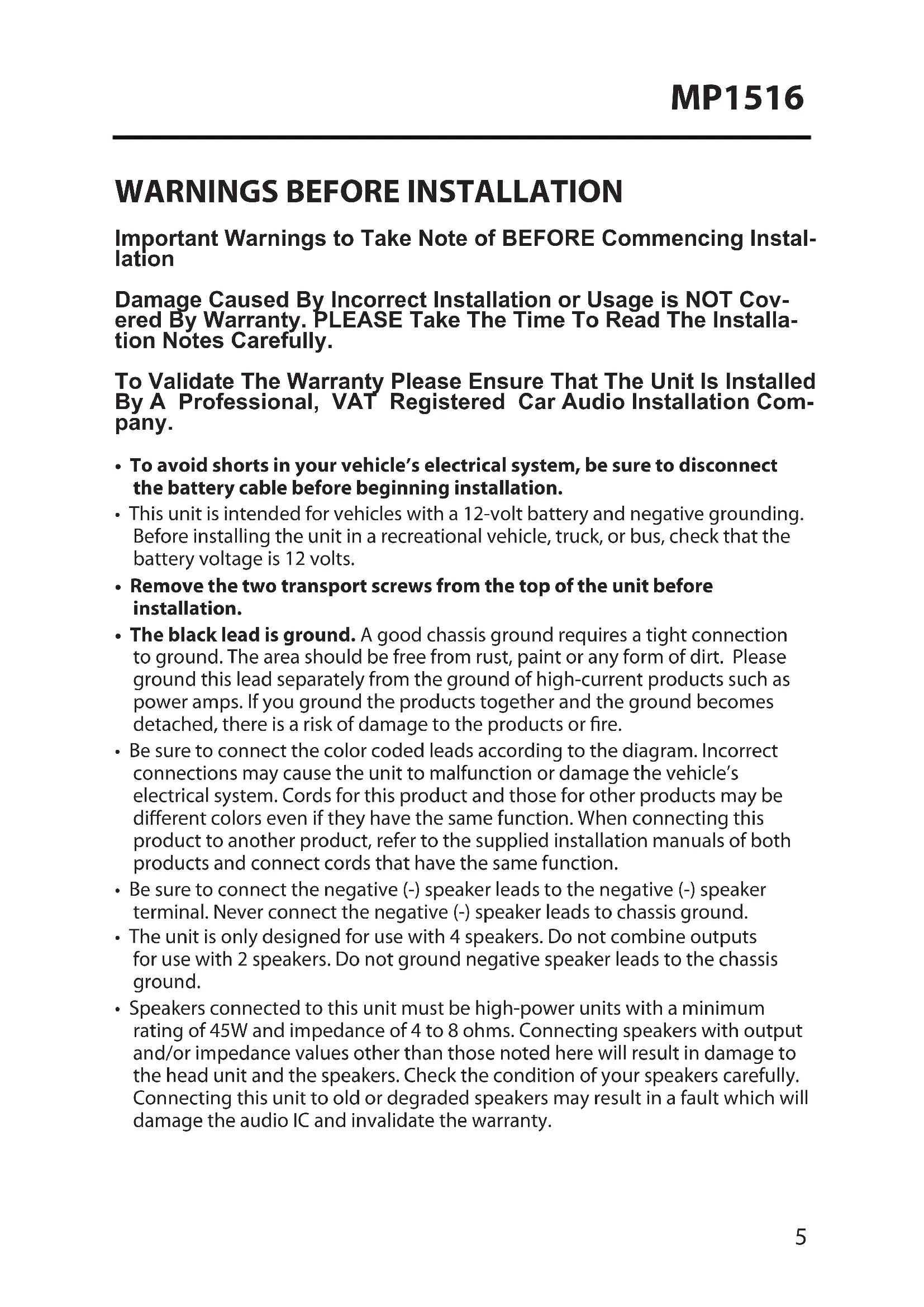Important Warnings to Take Note of BEFORE Commencing Instal- lation Damage Caused By Incorrect Installation or Usage is NOT Cov- ered By Warranty. PLEASE Take The Time To Read The Installa- tion Notes Carefully. To Validate The Warranty Please Ensure That The Unit Is Installed By A Professional, VAT Registered Car Audio Installation Com- pany.