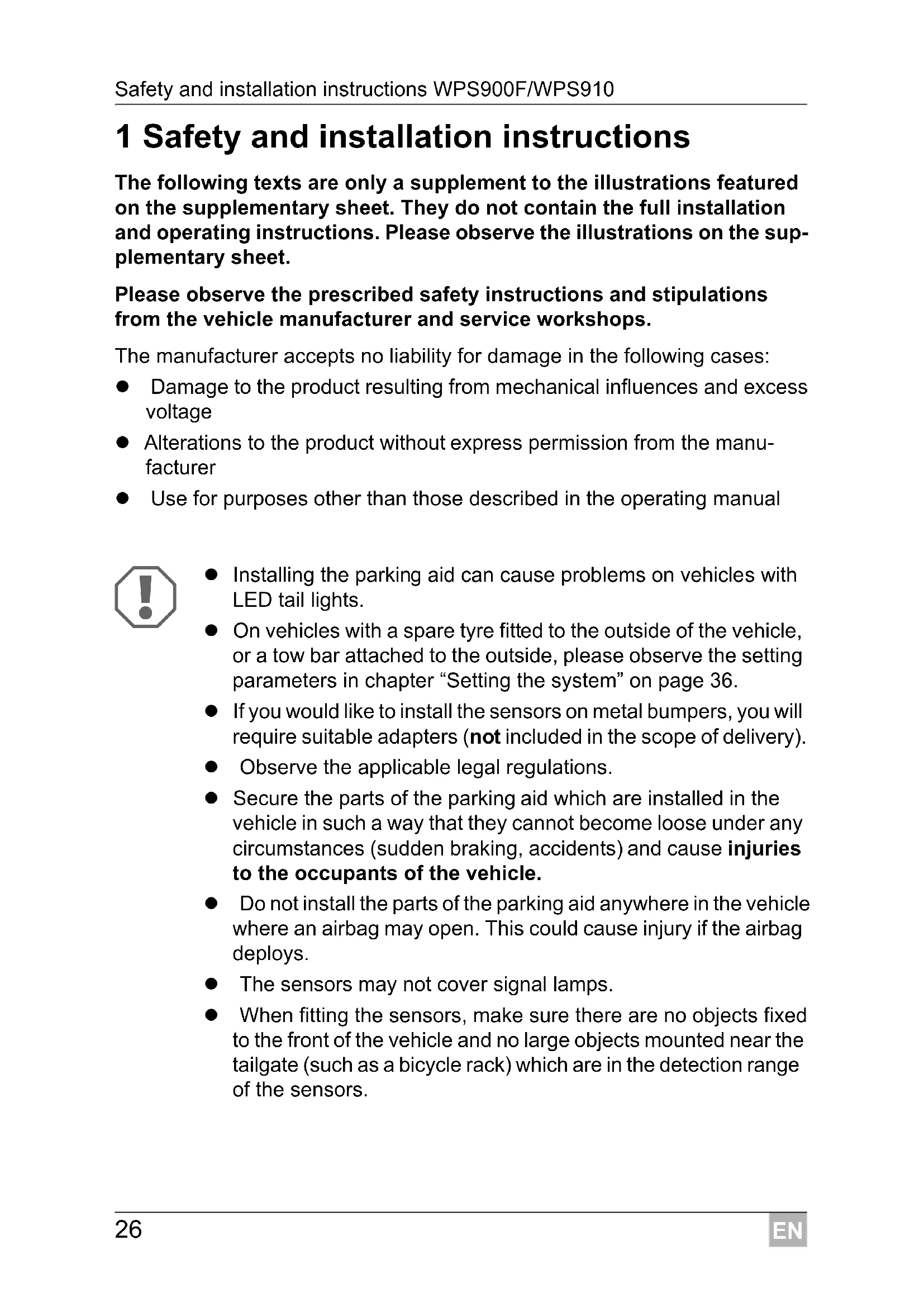 The front sensors shut down too early The front sensors shut down before the speed reaches 10 km/h. The LEDs in the control unit and on the external button switch off. ➤ Set parameter 14 (“number of speed signal pulses”) to function “59”, “61”, “62” or “63” (see chapter “Programming the system” on page 37). Device indicates obstacles incorrectly False alarms may have the following causes: Dirt or frost on the sensors ➤ Clean the sensors. Rain ➤ Check whether the front sensors are deactivated at a speed exceeding 10 km/h. ➤ Check whether a compatible speed signal is available. If there is no speed signal available, set parameter 1 (“Speed sig- nal/Time-out front sensors”) to function “14”, “15” or “16” (see chapter “Programming the system” on page 37). The sensors were incorrectly installed. ➤ Adjust the position or height of the sensors (fig. 2). ➤ Make sure that the appropriate sensor bracket was used (0°/12°/20°/bracket for metal bumpers). The sensors are in contact with the chassis. ➤ Separate the sensors from the chassis. No acoustic signal. ➤ Check whether the yellow LED in the control unit and the LED on the external button light up. When the LEDs are flashing, the system is in emergency mode. Start the vehicle again.EN WPS900F/WPS910 Guarantee
