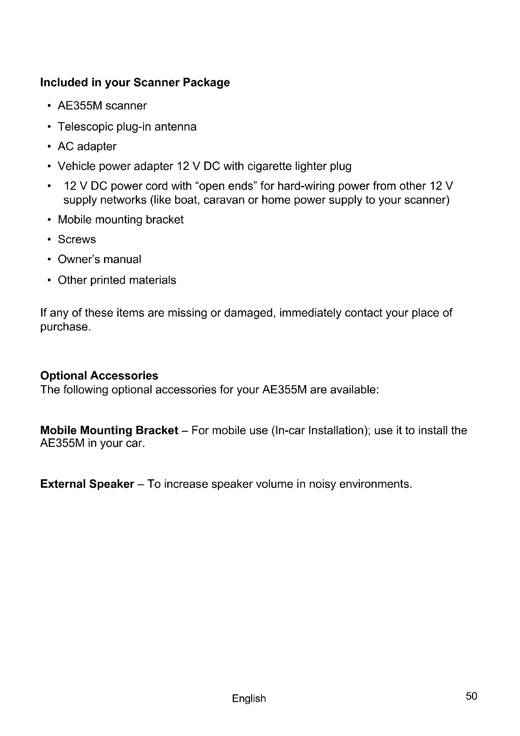 About your new AE355M Scanner The AE355M comes with 7 service banks for monitoring radio communication services like EMG (rescue, fire brigade, police and other emergency organizations, Freenet & PMR446, Commercial VHF & UHF Radio, Air Band, Marine Radio, CB & 10 m Band AM and FM frequencies. These service banks contain already factory pre-programmed often used frequencies. In addition the AE355M has 23 separate band searches. You can also save up to 300 frequencies that are scanned along with the preset frequencies. So whenever you encounter a newly activated local frequency for any service category, you can add it to the bank for that category. This gives you quick access to the frequencies you want to hear. Feature Summary The AE355M is a compact mobile/base scanner and one of the most user-friendly communication products available today. The AE355M features include: