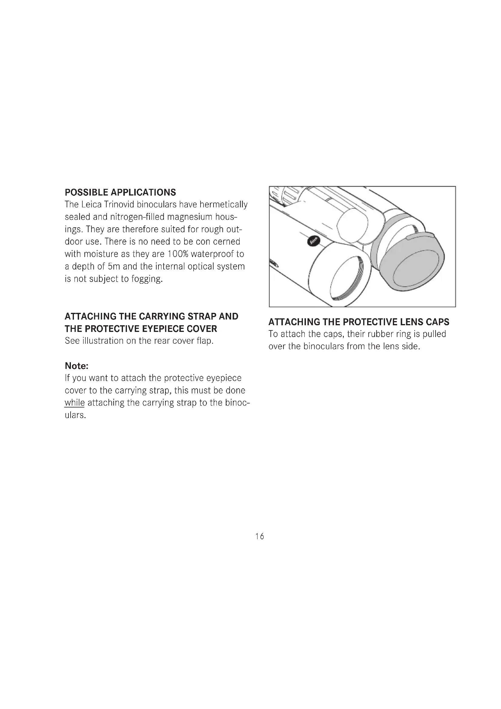 POSSIBLE APPLICATIONS The Leica Trinovid binoculars have hermetic ally sealed and nitrogen-filled magnesium hous- ings. They are therefore suited for rough out- door use. There is no need to be con cerned with moisture as they are 100% waterproof to a depth of 5m and the internal optical system is not subject to fogging.