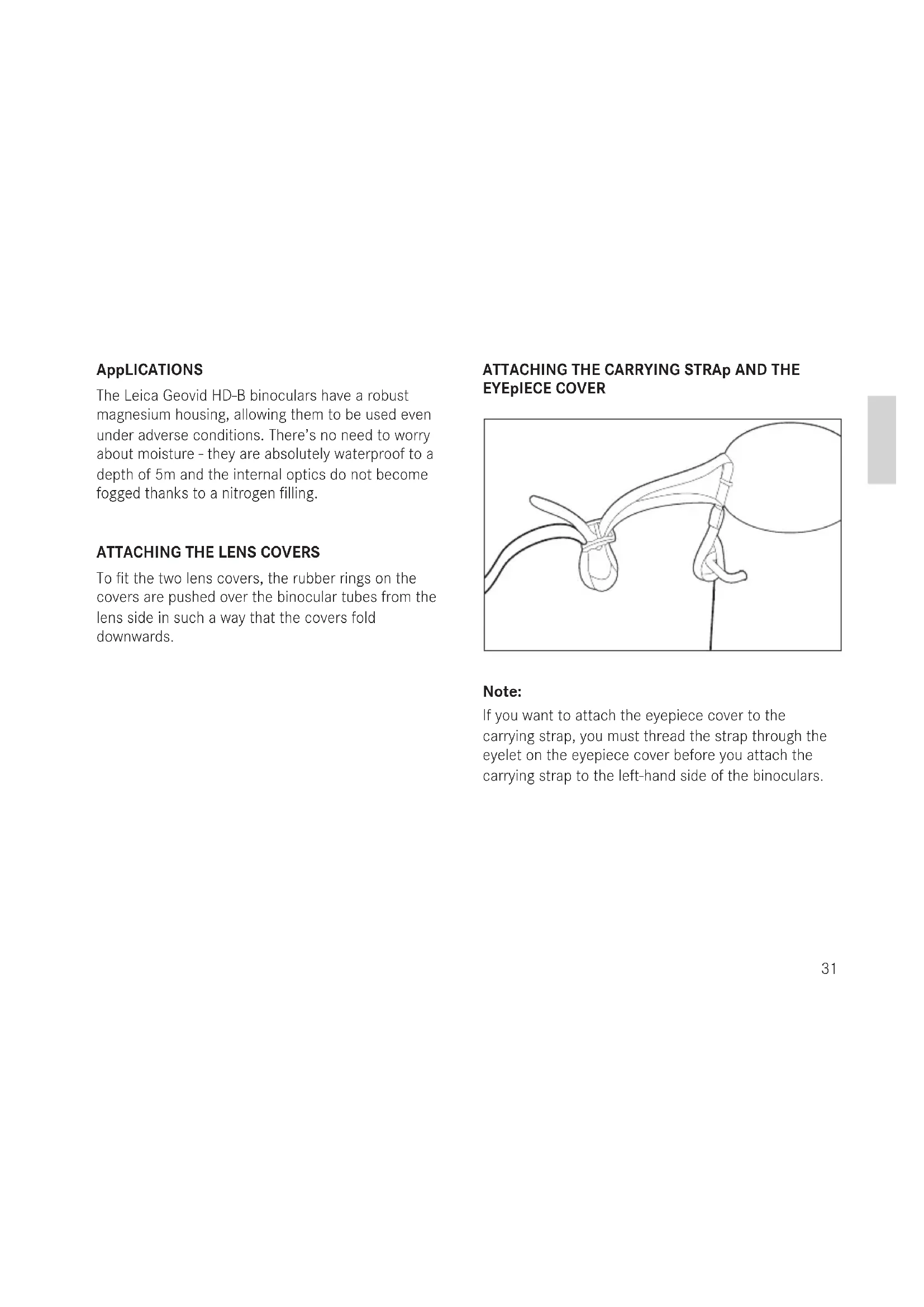 To fit the two lens covers, the rubber rings on the covers are pushed over the binocular tubes from the lens side in such a way that the covers fold downwards. ATTACHING THE CARRYING STRAp AND THE EYEpIECE COVER Note: If you want to attach the eyepiece cover to the carrying strap, you must thread the strap through the eyelet on the eyepiece cover before you attach the carrying strap to the left-hand side of the binoculars.32