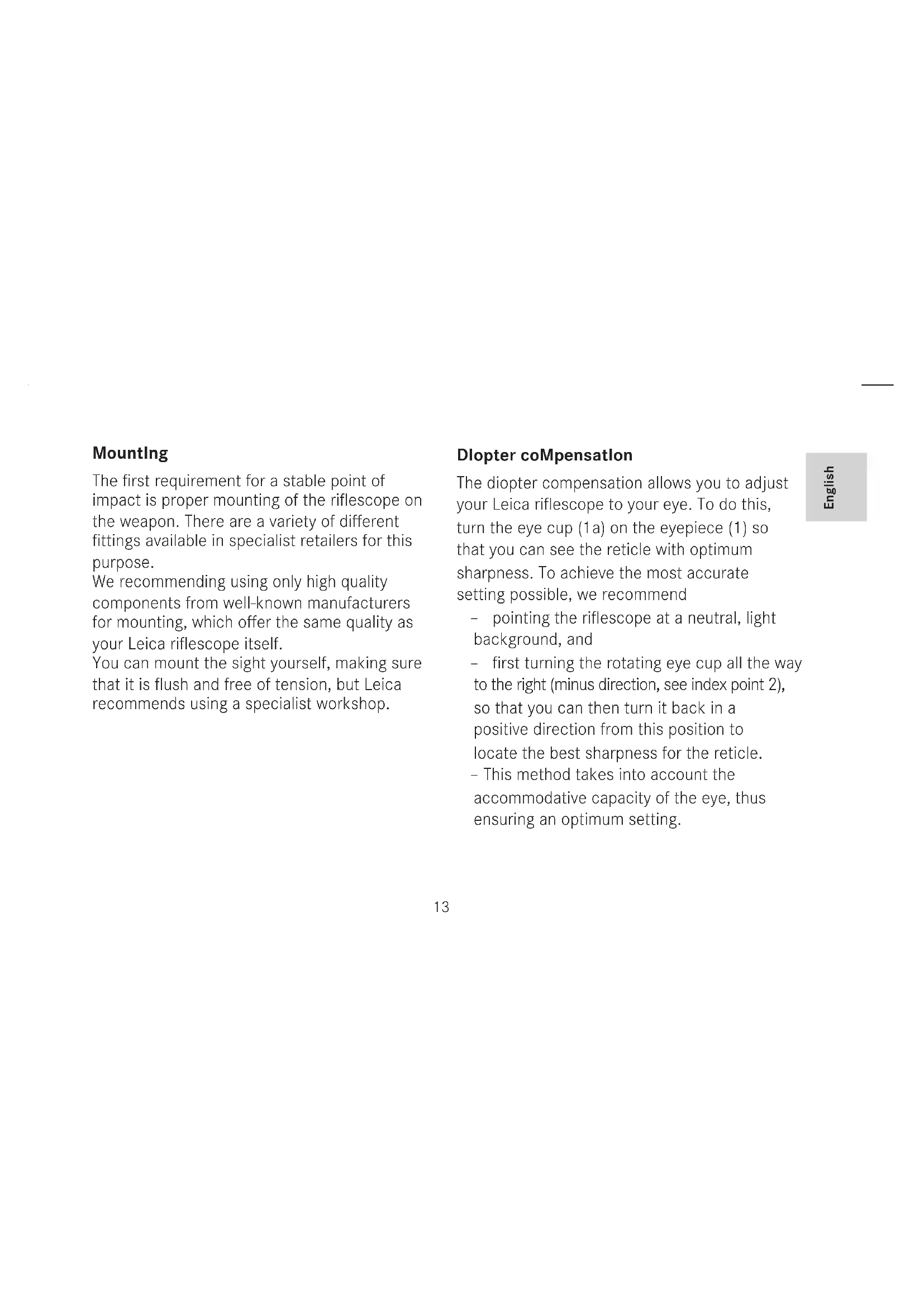 MountIng The first requirement for a stable point of impact is proper mounting of the riflescope on the weapon. There are a variety of different fittings available in specialist retailers for this purpose. We recommending using only high quality components from well-known manufacturers for mounting, which offer the same quality as your Leica riflescope itself. You can mount the sight yourself, making sure that it is flush and free of tension, but Leica recommends using a specialist workshop. DIopter coMpensatIon The diopter compensation allows you to adjust your Leica riflescope to your eye. To do this, turn the eye cup (1a) on the eyepiece (1) so that you can see the reticle with optimum sharpness. To achieve the most accurate setting possible, we recommend – pointing the riflescope at a neutral, light background, and – first turning the rotating eye cup all the way to the right (minus direction, see index point 2), so that you can then turn it back in a positive direction from this position to locate the best sharpness for the reticle. – This method takes into account the accommodative capacity of the eye, thus ensuring an optimum setting.elevatIon anD lateral aDjustMent In case of variations in the point of impact, adjustment of the reticle to the weapon is required. This is done using the two adjusting towers - (5) for the elevation, (6) for lateral, with both adjusted in the same way: First unscrew the cap (5.a/6.a) counter clockwise. Once the cap is removed, the knurled dial 5.b/6.b is visible, along with the associated scale 5.c/6.c and the correspond- ing index point 5.d/6.d. The knurled dials are very precisely graduated, with one click corresponding to 1cm at 100m. If the point of impact is high, requiring downward correction, turn the knurled dial 5.b counter clockwise, or clockwise to correct upwards if the point of impact is low. Make the lateral adjustments in the same way: If the point of impact is right, requiring correction to the left, turn the knurled dial 6.b counter clockwise, or clockwise to correct to the right if the point of impact is left. "zeroIng" the tower scales (same procedure for both towers) The process is initially the same as that described in the previous section. Then,