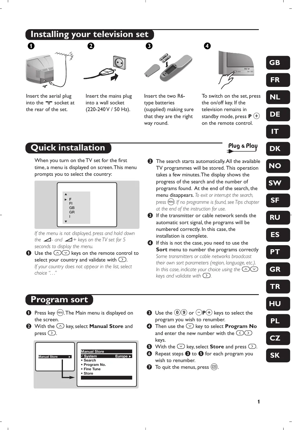 Insert the aerial plug into the : socket at the rear of the set. Insert the mains plug into a wall socket (220-240 V / 50 Hz). Insert the two R6type batteries (supplied) making sure that they are the right way round. To switch on the set, press the on/off key. If the television remains in standby mode, press P # on the remote control.