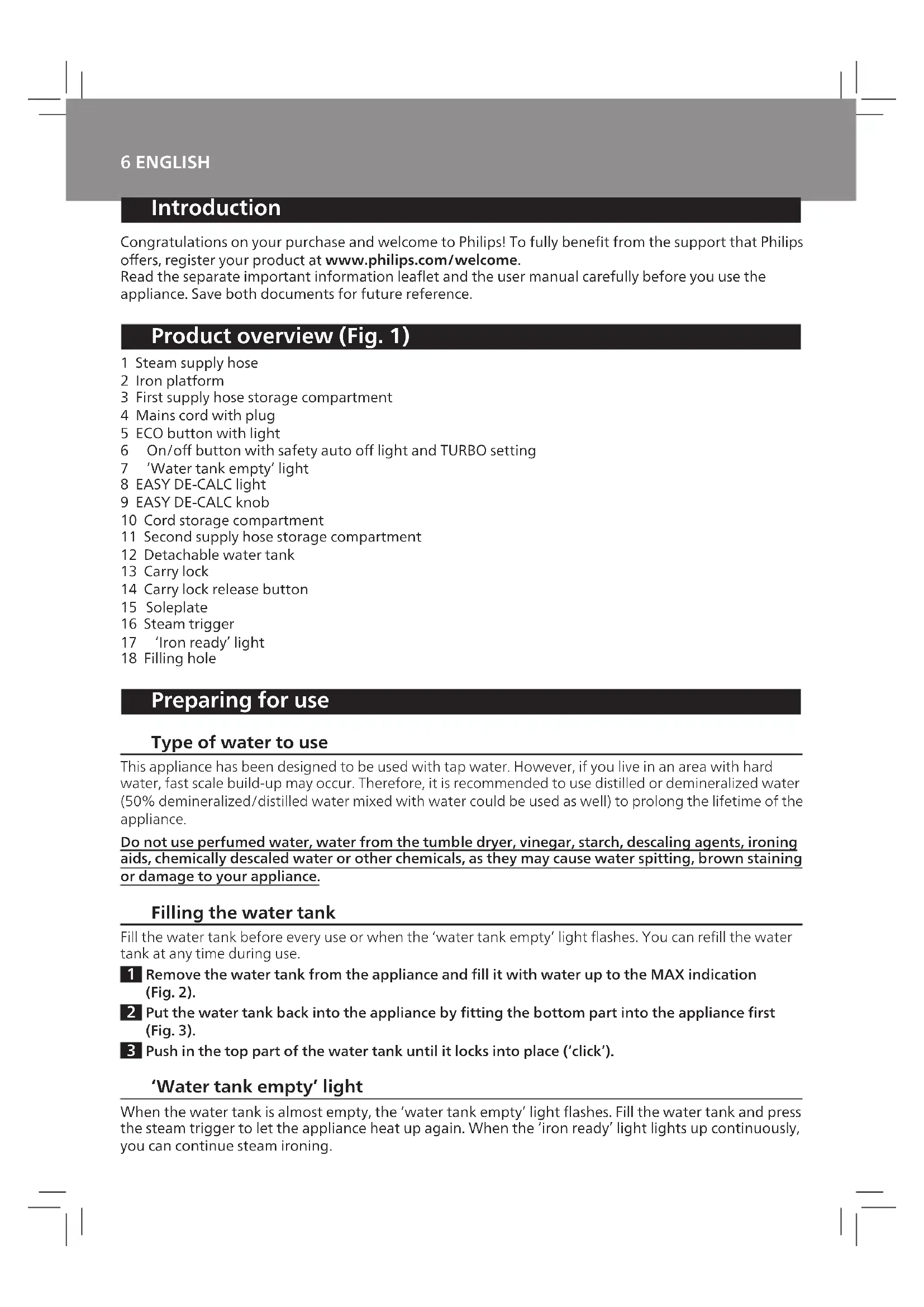 706 ENGLISH Introduction Congratulations on your purchase and welcome to Philips! To fully benet from the support that Philips oers, register your product at www.philips.com/welcome. Read the separate important information leaet and the user manual carefully before you use the appliance. Save both documents for future reference. Product overview (Fig. 1) 1 Steam supply hose 2 Iron platform 3 First supply hose storage compartment 4 Mains cord with plug 5 ECO button with light 6 On/o button with safety auto o light and TURBO setting 7 ’Water tank empty’ light 8 EASY DE-CALC light 9 EASY DE-CALC knob 10 Cord storage compartment 11 Second supply hose storage compartment 12 Detachable water tank 13 Carry lock 14 Carry lock release button 15 Soleplate 16 Steam trigger 17 ‘Iron ready’ light 18 Filling hole Preparing for use Type of water to use This appliance has been designed to be used with tap water. However, if you live in an area with hard water, fast scale build-up may occur. Therefore, it is recommended to use distilled or demineralized water (50% demineralized/distilled water mixed with water could be used as well) to prolong the lifetime of the appliance. Do not use perfumed water, water from the tumble dryer, vinegar, starch, descaling agents, ironing aids, chemically descaled water or other chemicals, as they may cause water spitting, brown staining or damage to your appliance. Filling the water tank Fill the water tank before every use or when the ‘water tank empty’ light ashes. You can rell the water tank at any time during use. 1 Remove the water tank from the appliance and ll it with water up to the MAX indication (Fig. 2). 2 Put the water tank back into the appliance by tting the bottom part into the appliance rst (Fig. 3). 3 Push in the top part of the water tank until it locks into place (‘click’). ‘Water tank empty’ light When the water tank is almost empty, the ‘water tank empty’ light ashes. Fill the water tank and press the steam trigger to let the appliance heat up again. When the ‘iron ready’ light lights up continuously, you can continue steam ironing.7ENGLISH OptimalTEMP Technology The Optimal TEMP Technology enables you to iron all types of ironable fabrics, in any order, without adjusting the iron temperature setting. It is safe to just rest the hot soleplate directly on the ironing board (Fig. 4) without putting back to the iron platform. This will help reduce the stress on your wrist. - Fabrics with these symbols are ironable, for example linen, cotton, polyester, silk, wool, viscose and rayon (Fig. 5). - Fabrics with this symbol are not ironable. These fabrics include synthetic fabrics such as Spandex or elastane, Spandex-mixed fabrics and polyolens (e.g. polypropylene), but also prints on garments (Fig. 6). Using your appliance Ironing 1 Place the steam generator on a stable and even surface. 2 Make sure that there is enough water in the water tank (see section ‘Filling the water tank’). 3 Put the mains plug in an earthed wall socket and press the on/o button to switch on the steam generator. The blue power-on light on the appliance and the ‘iron ready’ light start to ash to indicate that the appliance is heating up (this takes approx. 2 minutes) (Fig. 7). , When the appliance is ready for use, the ‘iron ready light’ and the power-on light stop ashing and light up continuously. Additionally you hear a short beep. 4 Press the carry lock release button to unlock the iron from the iron platform (Fig. 8). 5 Press and hold the steam trigger to start ironing. (Fig. 9) Never direct steam at people. Steam boost function The steam boost function is designed to help tackle dicult creases. - Double press the steam trigger for a continuous shot of steam (Fig. 10). It is not necessary to press and hold the steam trigger continuously when the steam boost function is activated. To stop the steam boost function, press the steam trigger once. Vertical ironing Hot steam is emitted from the iron. Never attempt to remove creases from a garment that someone is wearing. Do not apply steam near your or someone else’s hand. You can use the iron in vertical position to remove wrinkles from hanging fabrics. 1 Hold the iron in vertical position, press the steam trigger and touch the garment slightly with the soleplate (Fig. 11). Energy saving ECO mode - By using the ECO mode (reduced amount of steam), you can save energy without compromising on the ironing result. The green light is on (Fig. 12). - You can deactivate the ECO mode by pressing the ECO button. The green light goes o. Safety auto-o mode - To save energy, the appliance switches o automatically when it has not been used for 10minutes. The auto-o light in the on/o button starts to ash (Fig. 13).8 ENGLISH - To activate the appliance again, press the on/o button. The appliance then starts to heat up again. Note: The appliance is not switched o completely when it is in safety auto-o mode. To switch o the appliance, press the on/o button. Turbo steam For faster ironing and a higher amount of steam, you can use Turbo steam. 1 Press and hold the on/o button for 2 seconds until the light turns white. (Fig. 14) 2 To deactivate Turbo steam, press and hold the on/o button again for 2 seconds until the white light turns blue. Ironing tips Minimising wrinkles while drying Start wrinkle removal early in the drying process by spreading out your laundry properly after washing and by putting garments on hangers to make them dry naturally with fewer wrinkles. Best practice shirt ironing Start with the time-consuming parts like collar, cu links and sleeves. Next, iron the bigger parts like front and back to prevent wrinkling the bigger parts when you are busy ironing the time-consuming parts. Collar: When you iron a collar, start on its underside and work from the outside (the pointy end) inwards. Turn over and repeat. Fold down the collar and press the edge for a more crisp nish. Buttons: Iron on the reve