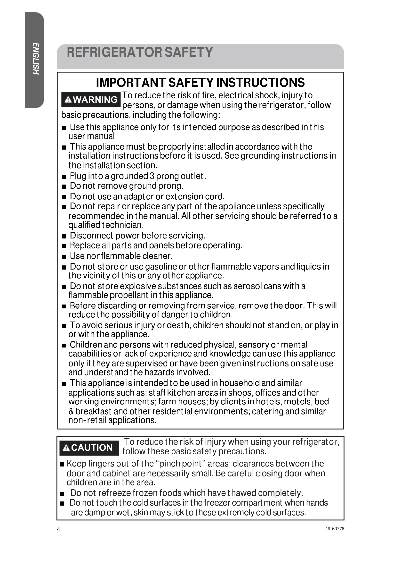 WARNING To reduce the risk of fire, electrical shock, injury to persons, or damage when using the refrigerator, follow basic precautions, including the following:5 49-60776ENGLISH STATE OF CALIFORNIA PROPOSITION 65 WARNINGS: WARNING This product contains one or more chemicals known to the State of California to cause cancer and birth defects or other reproductive harm. REFRIGERATOR SAFETY