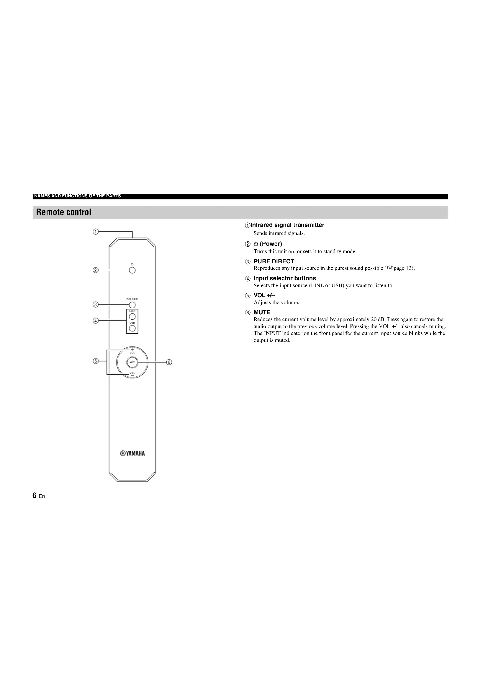 Remote control sensor Receives infrared signals from the remote control.NAMES AND FUNCTIONS OF THE PARTS 5 En English 1 USB (Type B) jack Used to connect a PC (+page 8).