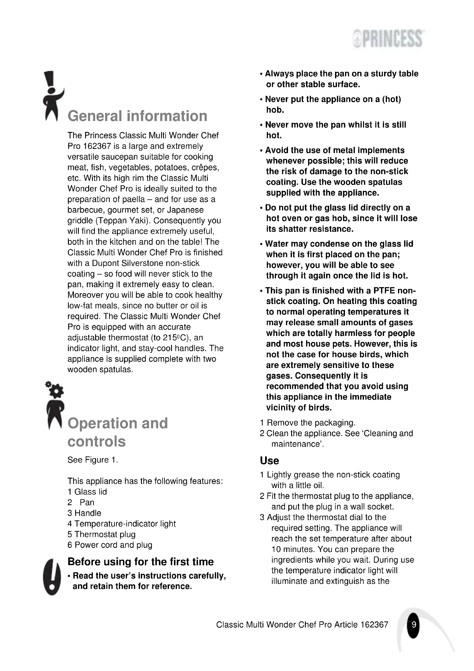 - This pan is finished with a PTFE non- stick coating. On heating this coating to normal operating temperatures it may release small amounts of gases which are totally harmless for people and most house pets. However, this is not the case for house birds, which are extremely sensitive to these gases. Consequently it is recommended that you avoid using this appliance in the immediate vicinity of birds. 1 Remove the packaging. 2 Clean the appliance. See ‘Cleaning and maintenance’. Use 1 Lightly grease the non-stick coating with a little oil. 2 Fit the thermostat plug to the appliance, and put the plug in a wall socket. 3 Adjust the thermostat dial to the required setting. The appliance will reach the set temperature after about 10 minutes. You can prepare the ingredients while you wait. During use the temperature indicator light will illuminate and extinguish as the Princess_Classic_Chef_2267.book Page 9 Tuesday, December 19, 2006 12:15 PM10 Classic Multi Wonder Chef Pro Article 162367 thermostat maintains the appliance at the set temperature. 4 When you have finished using the appliance remove the plug from the wall socket, and allow it to cool. 5 Allow the appliance to cool down completely before you remove the thermostat plug, since the temperature sensor on the thermostat plug (the central metal pin) becomes very hot. Frying times and temperatures The frying time depends largely on the type and thickness of the ingredients. You can experiment with the time and temperature to achieve the best results. The thermostat is not calibrated in degrees Celsius; it is marked with graduations from 1 through 6. This is because the actual temperature at a given setting depends on a wide range of factors, such as the ingredients in the pan and the use of oil/ butter or water, etc. The indicative temperatures for each setting are given in the following table: Thermostat ºC ºC setting oil & dry frying in water 1 110-125ºC 60-75 ºC 2 130-145ºC 100 ºC 3 160-170ºC 100 ºC 4 180-190ºC 100 ºC 5 200-210ºC 100 ºC 6 220-250ºC 100 ºC Cooking tips Small pieces of meat, fish, etc., will be done more rapidly, and will be cooked better than larger pieces. Turning meat and fish only once whilst frying will help prevent it from drying out. This will also be avoided by turning over the food with a spatula rather than pricking it with a fork. Frying or cooking fish for too long will make it tough, and will spoil the flavour. In general, fish is done when the tissue readily separates (into layers) and has lost its transparency or raw colour. Frying/Grilling Do not use more than a small quantity of oil or frying fat when frying or grilling food. Since the pan has a non-stick coating you can also decide to dispense with oil or fat altogether. The pan is not suitable for use as a deep fryer or an oil fondue. Coating fish with breadcrumbs, crumbled rusks or flour before you fry it will protect the fish from the heat and prevent it from drying out. After frying the fish place it on a piece of paper kitchen towel to drain. Stir-frying Stir-fried dishes are prepared by continually stirring and turning until the ingredients are done. Only a little oil is required; the pan is set to a high temperature. Put the meat or fish in the pan, and turn it repeatedly until it is about three-quarters done. You can then add the further ingredients, such as carrots, onions, mushrooms, paprikas, courgettes, and/or a little thin sauce, etc., etc., and continue cooking until the meat or fish is done. Stir-frying is healthy since only a little oil is required, little or no salt needs to be added, and the vitamins are retained. Moreover the food is delicious since this method of preparation does full justice to the flavour of the ingredients – and the vegetables remain crisp. Cooking Food is cooked by heating it in boiling liquid until it is done. The Classic Multi Wonder Chef Pro is very suitable for cooking moderate quantities of pasta and Princess_Classic_Chef_2267.book Page 10 Tuesday, December 19, 2006 12:15 PM11 Classic Multi Wonder Chef Pro Article 162367 rice. The Classic Multi Wonder Chef Pro is, in particular, ideally suited to cooking spaghetti; the pan has a larger diameter than many other pans available, and you do not need to shorten the spaghetti. The cooking times stated in the enclosed recipes serve only as guidelines. The actual cooking times depend on the quality of the meat and the freshness of the vegetables, etc., and will vary from dish to dish. Poaching Poached foods are cooked slowly in a liquid just below boiling point. The liquid is at the correct temperature for poaching once the surface just begins to move. The quantity and temperature of the liquid used for poaching depends on the food being cooked. Meat, fish and poultry are usually poached in bouillon; eggs are poached in water containing a little salt and, often, a drop of vinegar. Fruit can be poached in a thin syrup. Poaching imparts a delicate flavour to the food, since a little flavour from the liquid is added to the poached ingredients. Obviously other liquids can also be used for poaching, such as milk and vinegar. Stewing Food is stewed by briefly frying the surface and then allowing it to cook very slowly at a low temperature. Stewing is ideal for preparing a hash, since the Classic Multi Wonder Chef Pro offers you an opportunity to combine a wide variety of preparation methods. Lightly fry the meat, add the various ingredients, such as onions, cloves, cream, mushrooms and garlic, etc., and then allow to simmer for a couple of hours. Thawing You can also use the Classic Multi Wonder Chef Pro to thaw food. Set the thermostat to position 1 and put the food to be thawed in the pan. Maintenance and cleaning