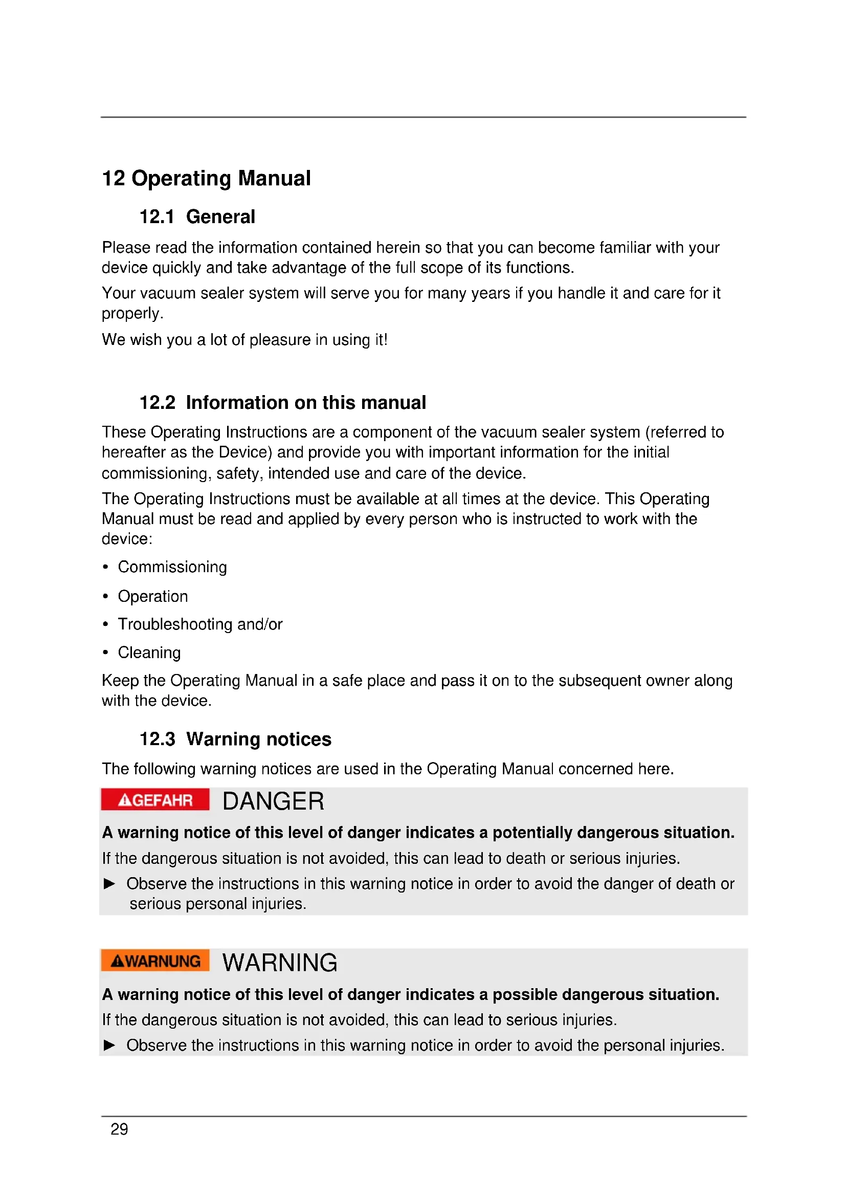 These Operating Instructions are a component of the vacuum sealer system (referred to hereafter as the Device) and provide you with important information for the initial commissioning, safety, intended use and care of the device.