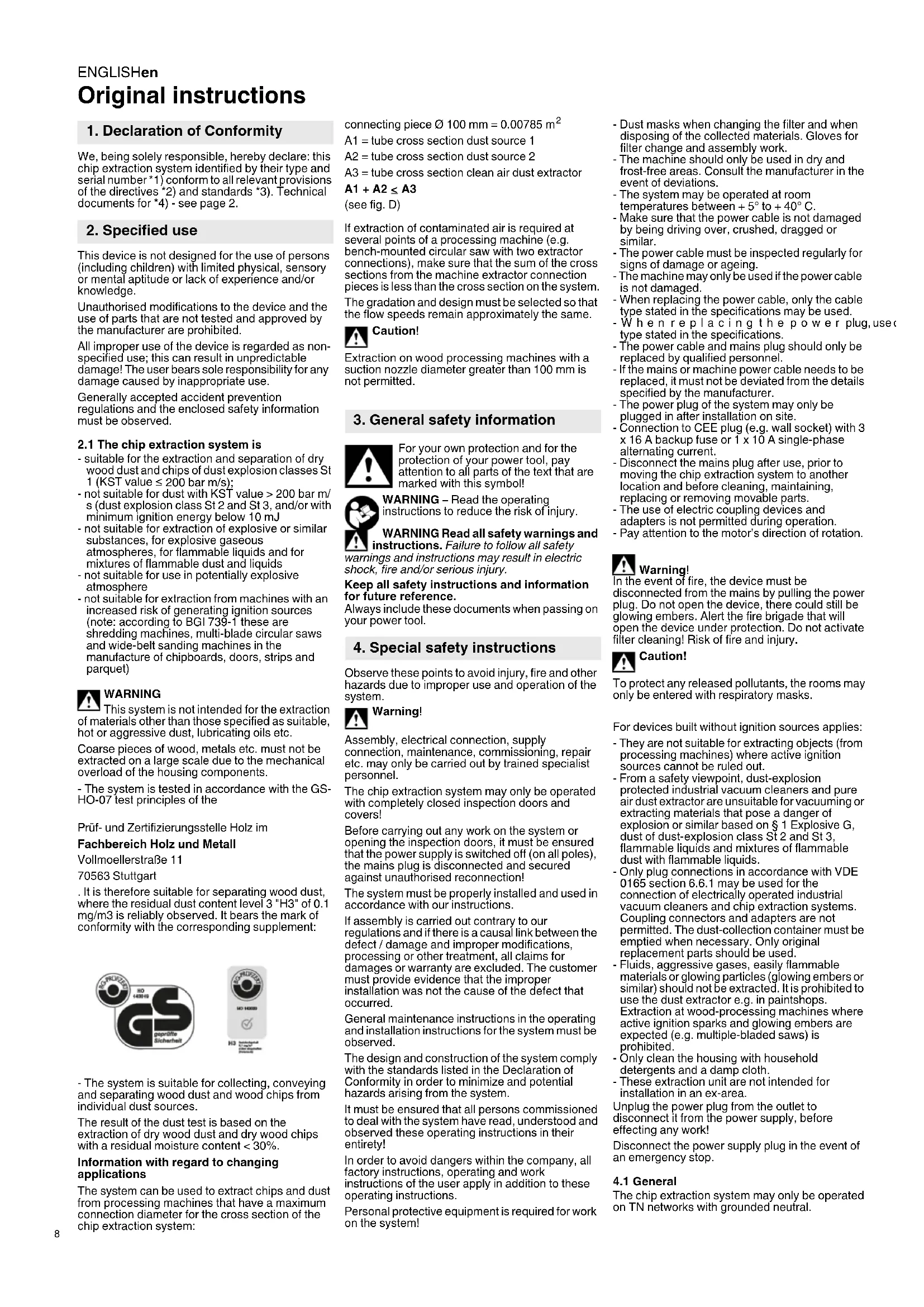 - suitable for the extraction and separation of dry wood dust and chips of dust explosion classes St 1 (KST value ≤ 200 bar m/s); - not suitable for dust with KST value > 200 bar m/ s (dust explosion class St 2 and St 3, and/or with minimum ignition energy below 10 mJ - not suitable for extraction of explosive or similar substances, for explosive gaseous atmospheres, for flammable liquids and for mixtures of flammable dust and liquids - not suitable for use in potentially explosive atmosphere - not suitable for extraction from machines with an increased risk of generating ignition sources (note: according to BGI 739-1 these are shredding machines, multi-blade circular saws and wide-belt sanding machines in the manufacture of chipboards, doors, strips and parquet) WARNING This system is not intended for the extraction of materials other than those specified as suitable, hot or aggressive dust, lubricating oils etc. Coarse pieces of wood, metals etc. must not be extracted on a large scale due to the mechanical overload of the housing components. - The system is tested in accordance with the GS- HO-07 test principles of the Prüf- und Zertifizierungsstelle Holz im Fachbereich Holz und Metall Vollmoellerstraße 11 70563 Stuttgart . It is therefore suitable for separating wood dust, where the residual dust content level 3 "H3" of 0.1 mg/m3 is reliably observed. It bears the mark of conformity with the corresponding supplement: - The system is suitable for collecting, conveying and separating wood dust and wood chips from individual dust sources. The result of the dust test is based on the extraction of dry wood dust and dry wood chips with a residual moisture content < 30%. Information with regard to changing applications The system can be used to extract chips and dust from processing machines that have a maximum connection diameter for the cross section of the chip extraction system: connecting piece Ø 100 mm = 0.00785 m