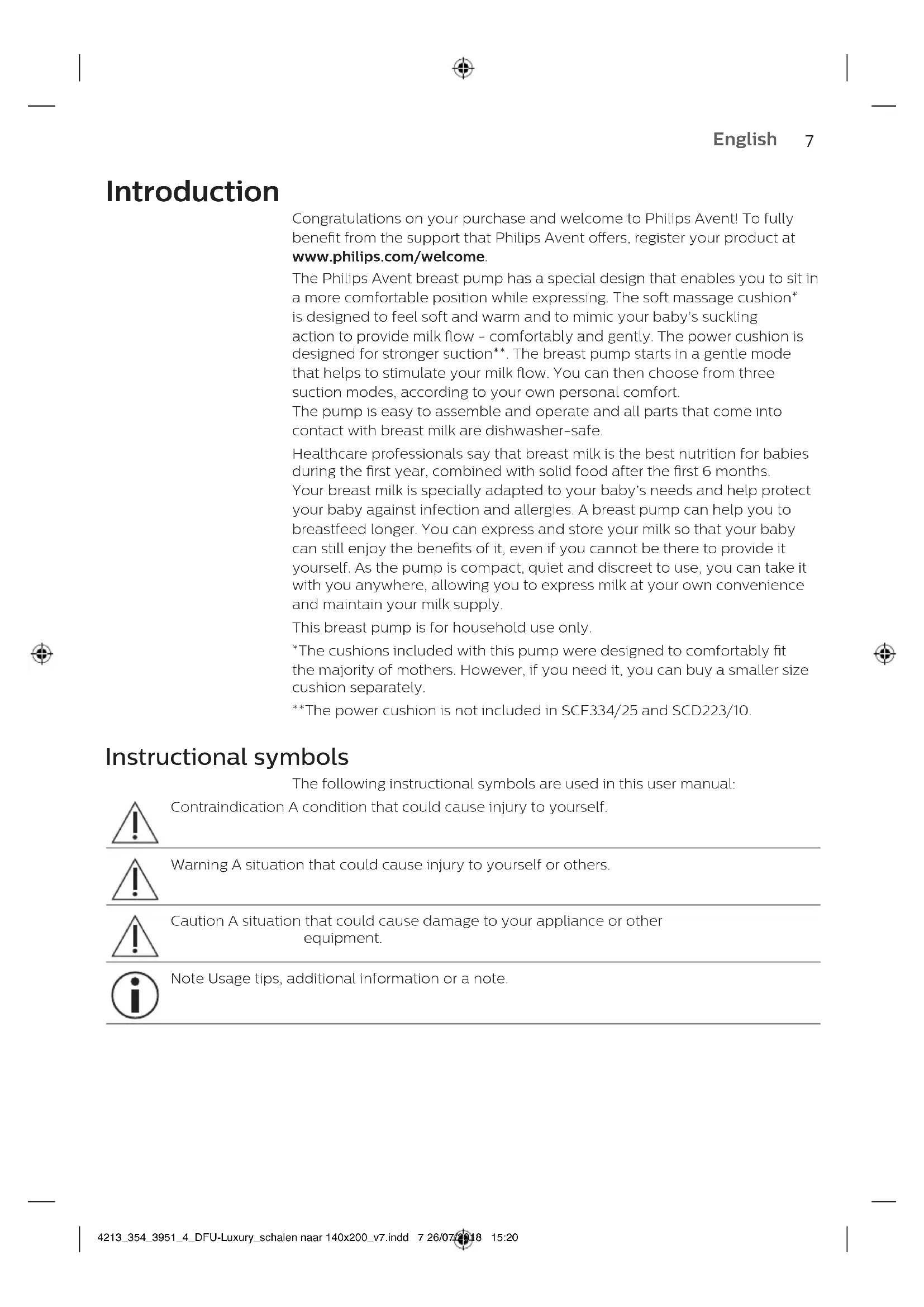 English 4213_354_3951_4_DFU-Luxury_schalen naar 140x200_v7.indd 6 26/07/2018 15:20Introduction Congratulations on your purchase and welcome to Philips Avent! To fully benet from the support that Philips Avent oers, register your product at www.philips.com/welcome. The Philips Avent breast pump has a special design that enables you to sit in a more comfortable position while expressing. The soft massage cushion* is designed to feel soft and warm and to mimic your baby’s suckling action to provide milk ow - comfortably and gently. The power cushion is designed for stronger suction**. The breast pump starts in a gentle mode that helps to stimulate your milk ow. You can then choose from three suction modes, according to your own personal comfort. The pump is easy to assemble and operate and all parts that come into contact with breast milk are dishwasher-safe. Healthcare professionals say that breast milk is the best nutrition for babies during the rst year, combined with solid food after the rst 6 months. Your breast milk is specially adapted to your baby’s needs and help protect your baby against infection and allergies. A breast pump can help you to breastfeed longer. You can express and store your milk so that your baby can still enjoy the benets of it, even if you cannot be there to provide it yourself. As the pump is compact, quiet and discreet to use, you can take it with you anywhere, allowing you to express milk at your own convenience and maintain your milk supply. This breast pump is for household use only. *The cushions included with this pump were designed to comfortably t the majority of mothers. However, if you need it, you can buy a smaller size cushion separately. **The power cushion is not included in SCF334/25 and SCD223/10. Instructional symbols The following instructional symbols are used in this user manual: Contraindication A condition that could cause injury to yourself. Warning A situation that could cause injury to yourself or others. Caution A situation that could cause damage to your appliance or other equipment. Note Usage tips, additional information or a note.