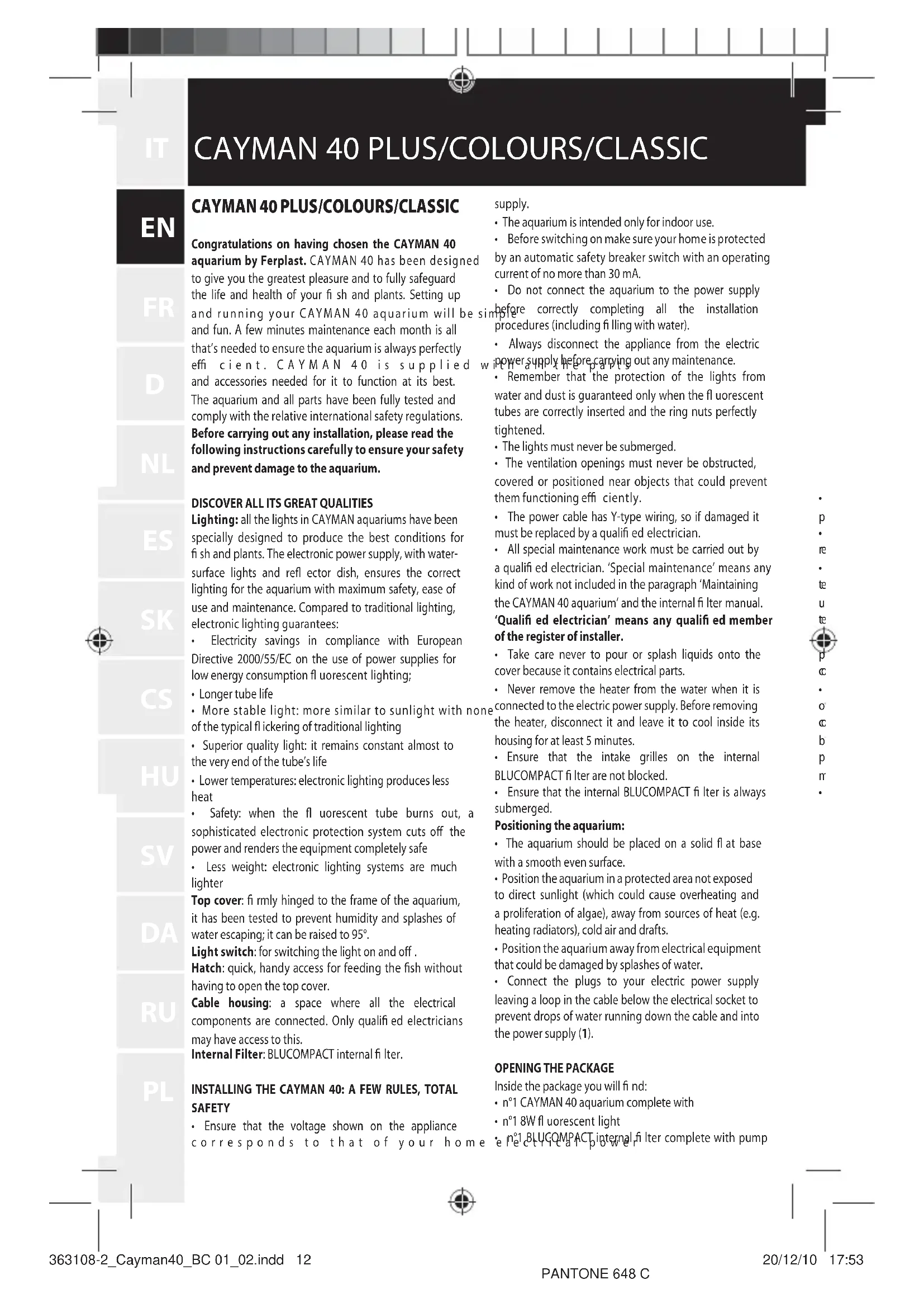 Congratulations on having chosen the CAYMAN 40 aquarium by Ferplast. CAYMAN 40 has been designed to give you the greatest pleasure and to fully safeguard the life and health of your fish and plants. Setting up and running your CAYMAN 40 aquarium will be s and fun. A few minutes maintenance each month is all that's needed to ensure the aquarium is always perfectly eff cient. CAYMAN 40 is supplied and accessories needed for it to function at its best. The aquarium and all parts have been fully tested and comply with the relative international safety regulations.