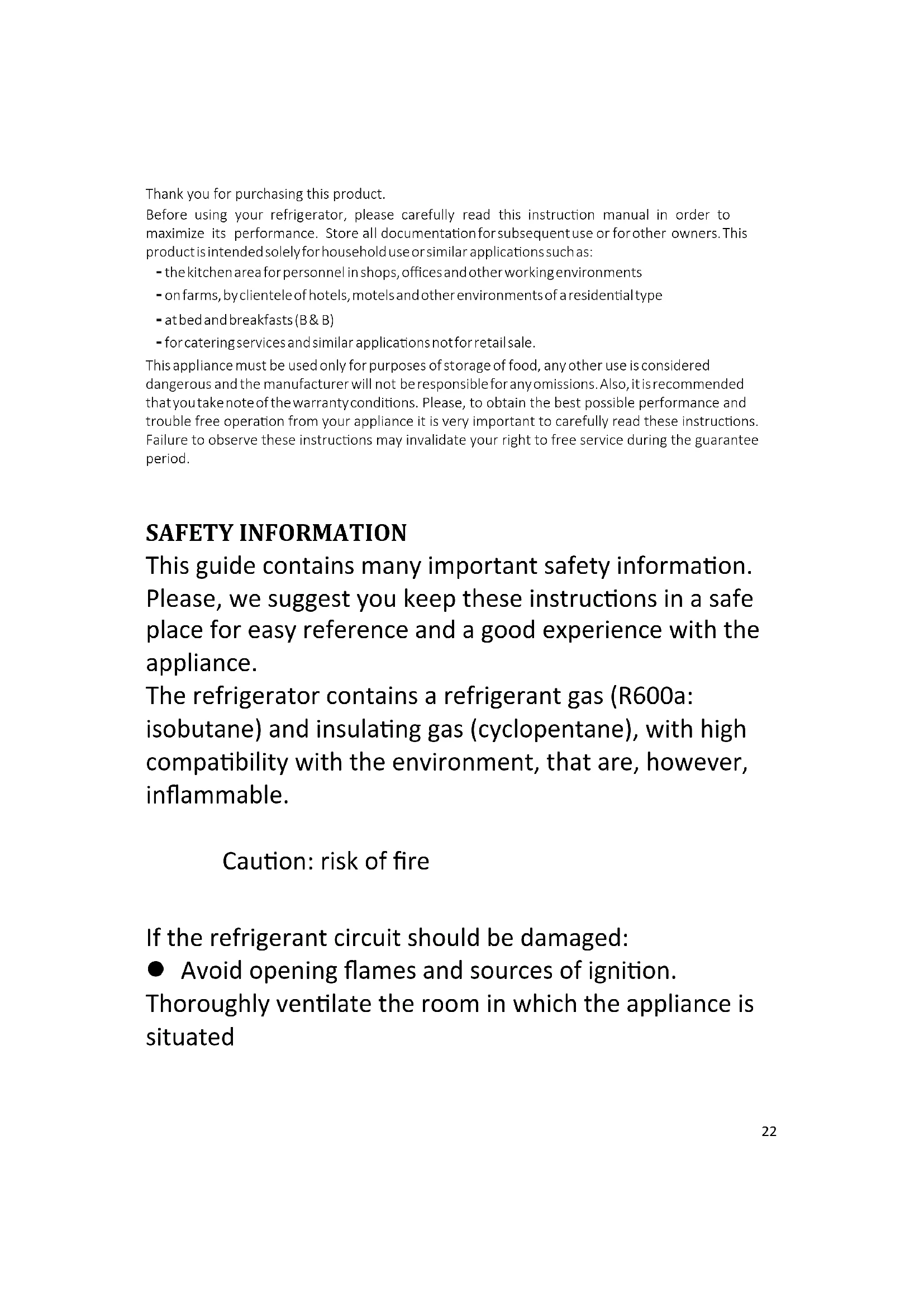 Thank you for purchasing this product. Before using your refrigerator, please carefully read this instruction manual in order to maximize its performance. Store all documentation for subsequent use or for other owners. This product is intended solely for household use or similar applications such as: - the kitchen area for personnel in shops, offices and other working environments - on farms, by clientele of hotels, motels and other environments of a residential type - at bed and breakfasts (B & B) - for catering services and similar applications not for retail sale. This appliance must be used only for purposes of storage of food, any other use is considered dangerous and the manufacturer will not be responsible for any omissions. Also, it is recommended that you take note of the warranty conditions. Please, to obtain the best possible performance and trouble free operation from your appliance it is very important to carefully read these instructions. Failure to observe these instructions may invalidate your right to free service during the guarantee period. SAFETY INFORMATION This guide contains many important safety information. Please, we suggest you keep these instructions in a safe place for easy reference and a good experience with the appliance. The refrigerator contains a refrigerant gas (R600a: isobutane) and insulating gas (cyclopentane), with high compatibility with the environment, that are, however, inflammable. Caution: risk of fire If the refrigerant circuit should be damaged: Avoid opening flames and sources of ignition. Thoroughly ventilate the room in which the appliance is situated Percentage running time: 18℃:Runing11min,stopping23
