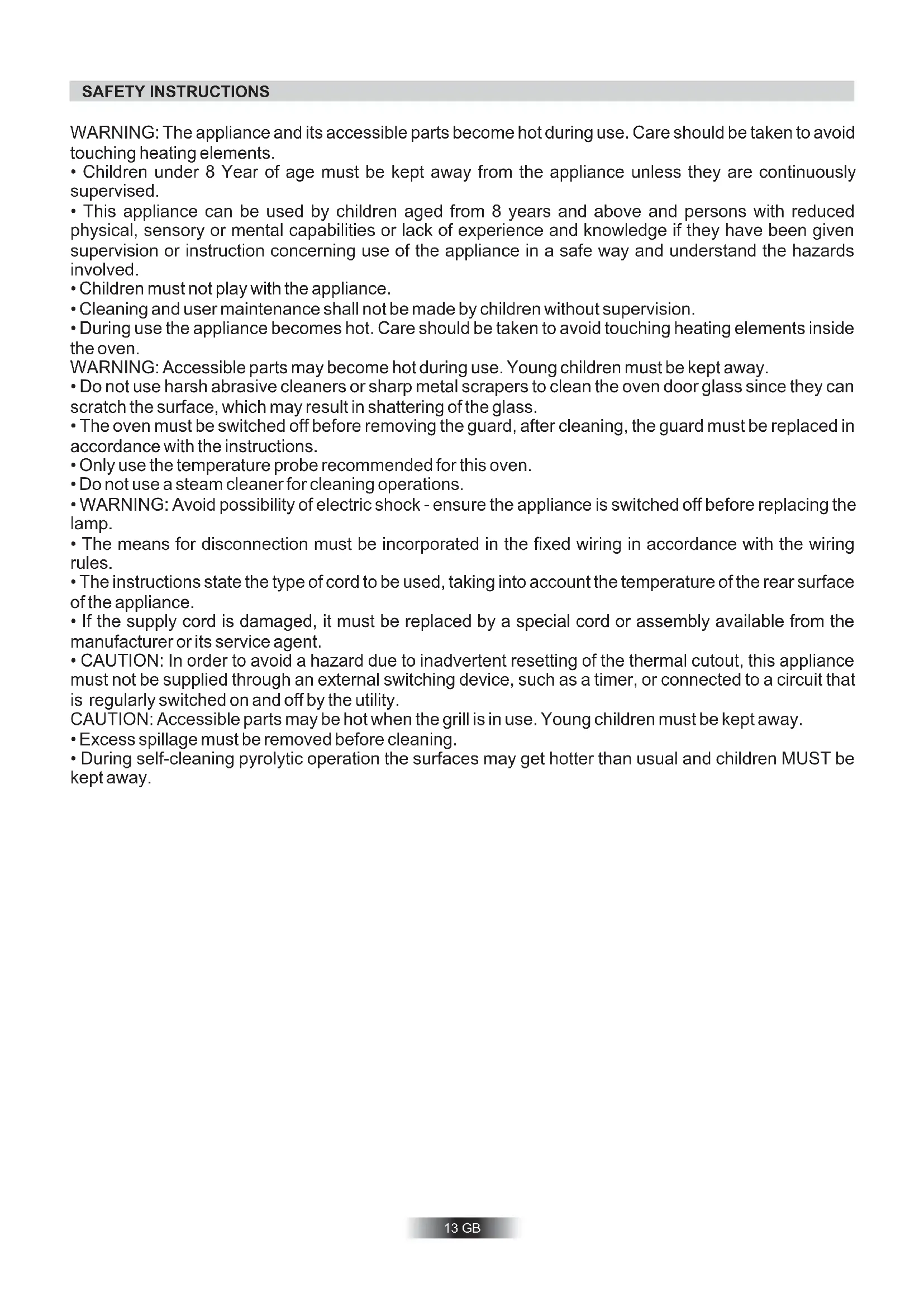 - During self-cleaning pyrolytic operation the surfaces may get hotter than usual and children MUST be kept away. SAFETY INSTRUCTIONS 13 GBGENERAL WARNINGS Thank you for choosing one of our products. To get the most out of your oven we recommend that you: