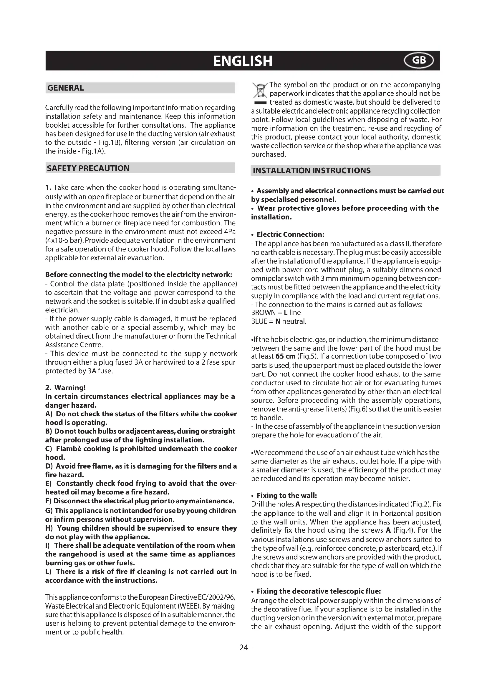 the rangehood is used at the same time as appliances burning gas or other fuels. L) There is a risk of fire if cleaning is not carried out in accordance with the instructions. This appliance conforms to the European Directive EC/2002/96, Waste Electrical and Electronic Equipment (WEEE). By making sure that this appliance is disposed of in a suitable manner, the user is helping to prevent potential damage to the environ- ment or to public health. The symbol on the product or on the accompanying paperwork indicates that the appliance should not be treated as domestic waste, but should be delivered to a suitable electric and electronic appliance recycling collection point. Follow local guidelines when disposing of waste. For more information on the treatment, re-use and recycling of this product, please contact your local authority, domestic waste collection service or the shop where the appliance was purchased. INSTALLATION INSTRUCTIONS
