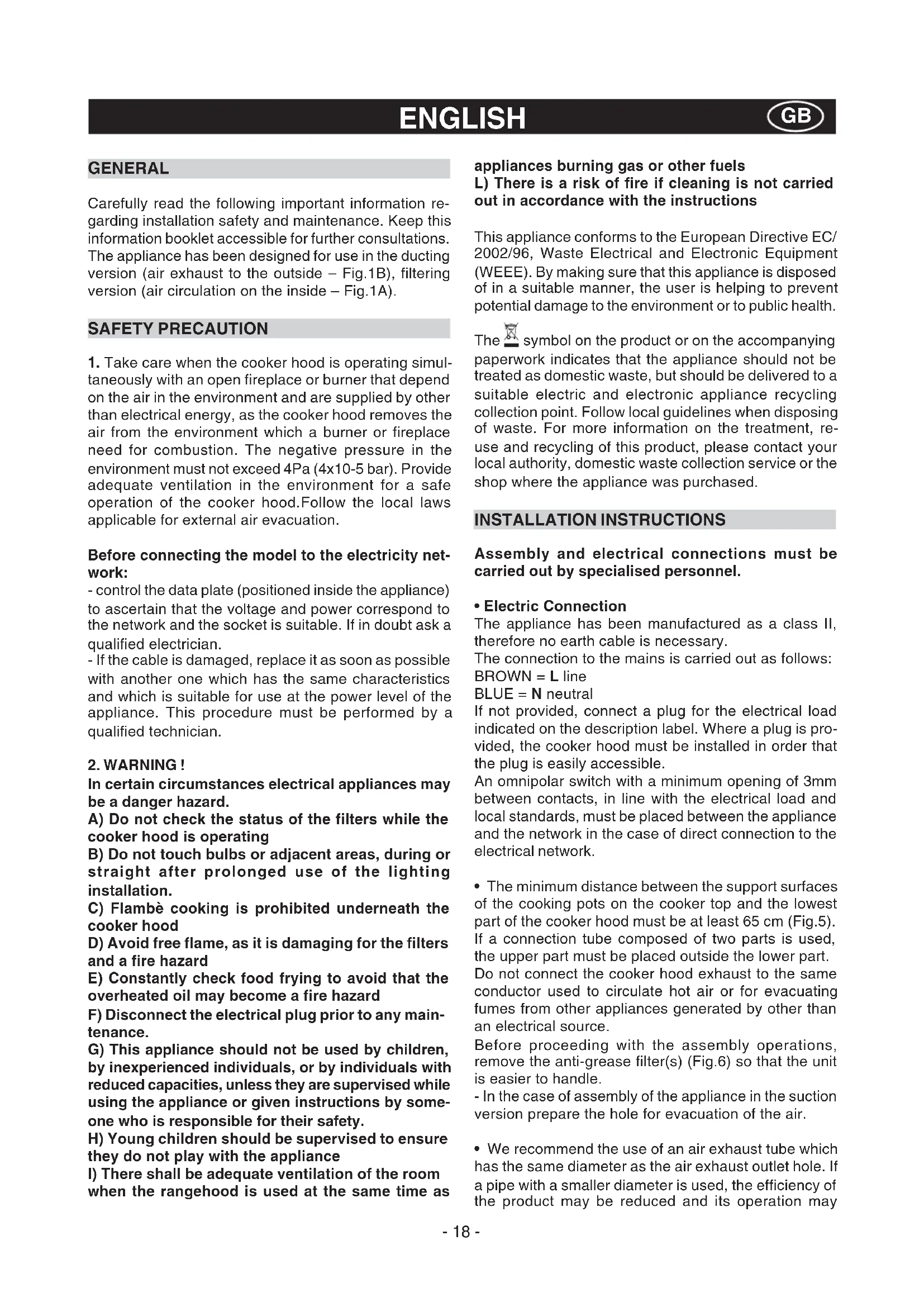 GENERAL Carefully read the following important information re- garding installation safety and maintenance. Keep this information booklet accessible for further consultations. The appliance has been designed for use in the ducting version (air exhaust to the outside – Fig.1B), filtering version (air circulation on the inside – Fig.1A). SAFETY PRECAUTION