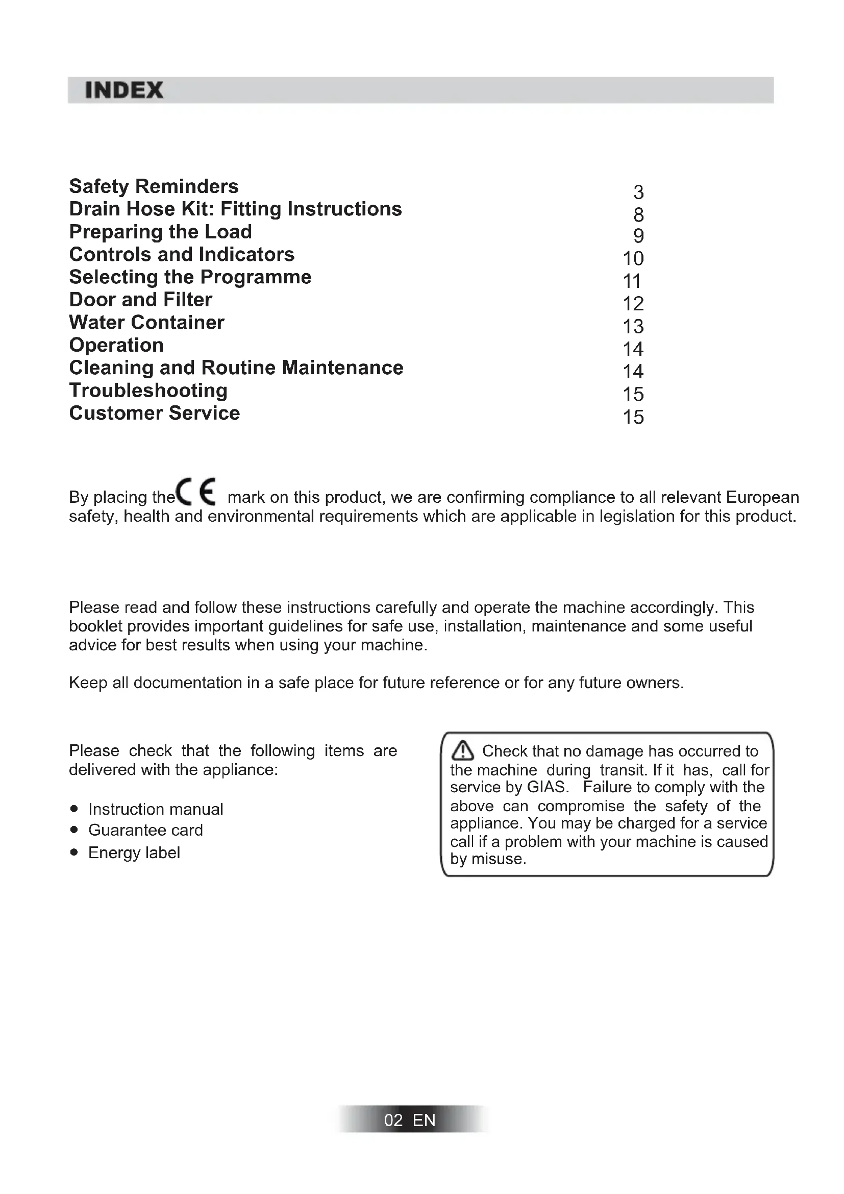 19802 EN Please check that the following items are delivered with the appliance: ● Instruction manual ● Guarantee card ● Energy label Please read and follow these instructions carefully and operate the machine accordingly. This booklet provides important guidelines for safe use, installation, maintenance and some useful advice for best results when using your machine. Keep all documentation in a safe place for future reference or for any future owners. Check that no damage has occurred to the machine during transit. If it has, call for service by GIAS. Failure to comply with the above can compromise the safety of the appliance. You may be charged for a service call if a problem with your machine is caused by misuse.