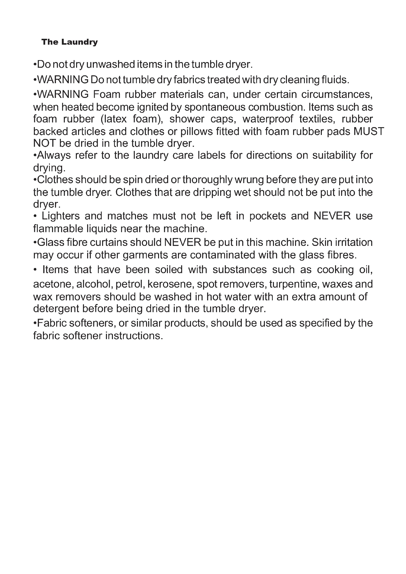- Items that have been soiled with substances such as cooking oil, acetone, alcohol, petrol, kerosene, spot removers, turpentine, waxes and wax removers should be washed in hot water with an extra amount of detergent before being dried in the tumble dryer.