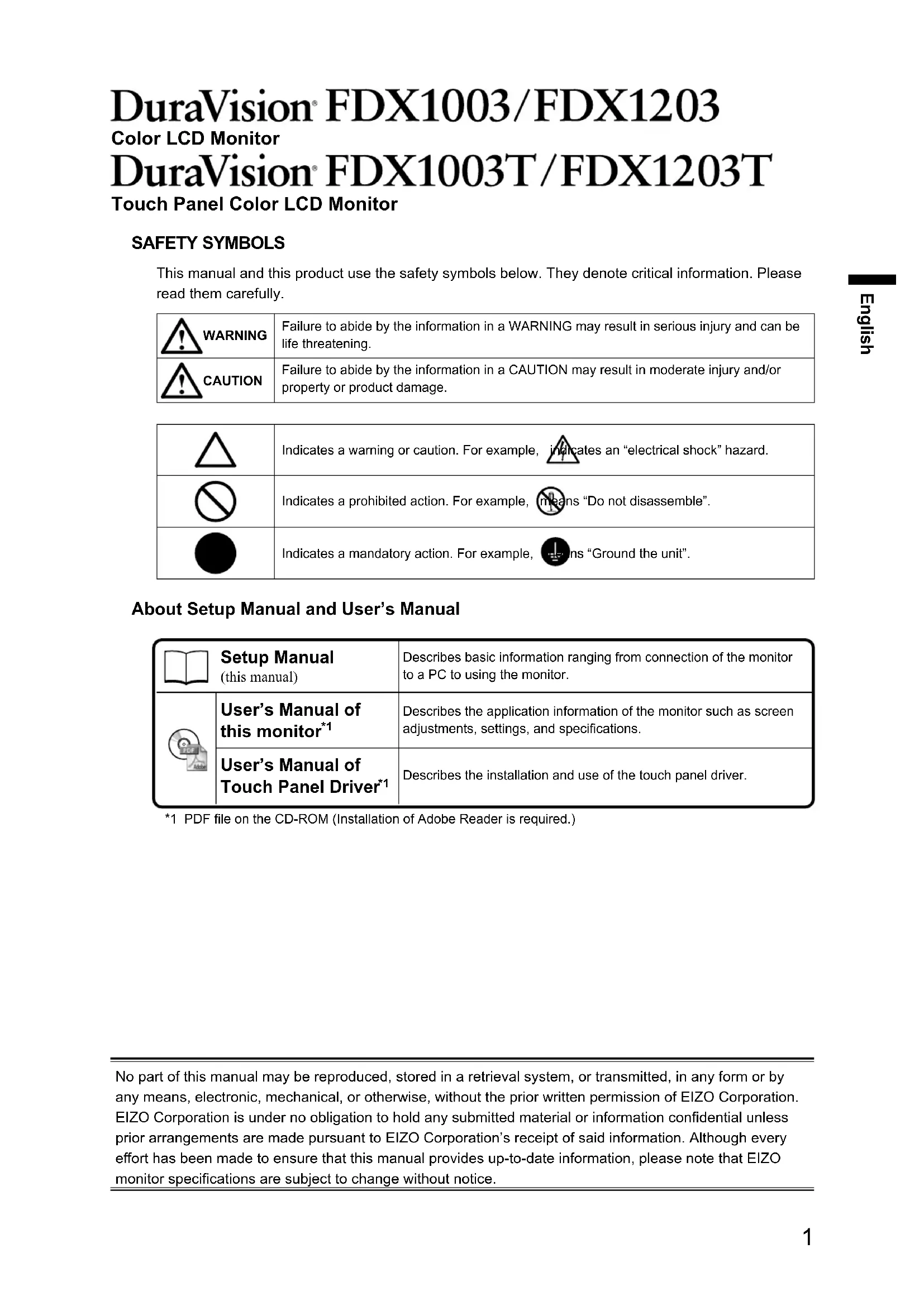 Describes the installation and use of the touch panel driver. *1 PDF le on the CD-ROM (Installation of Adobe Reader is required.) No part of this manual may be reproduced, stored in a retrieval system, or transmitted, in any form or by any means, electronic, mechanical, or otherwise, without the prior written permission of EIZO Corporation. EIZO Corporation is under no obligation to hold any submitted material or information condential unless prior arrangements are made pursuant to EIZO Corporation’s receipt of said information. Although every eort has been made to ensure that this manual provides up-to-date information, please note that EIZO monitor specications are subject to change without notice.2 PRECAUTIONS IMPORTANT