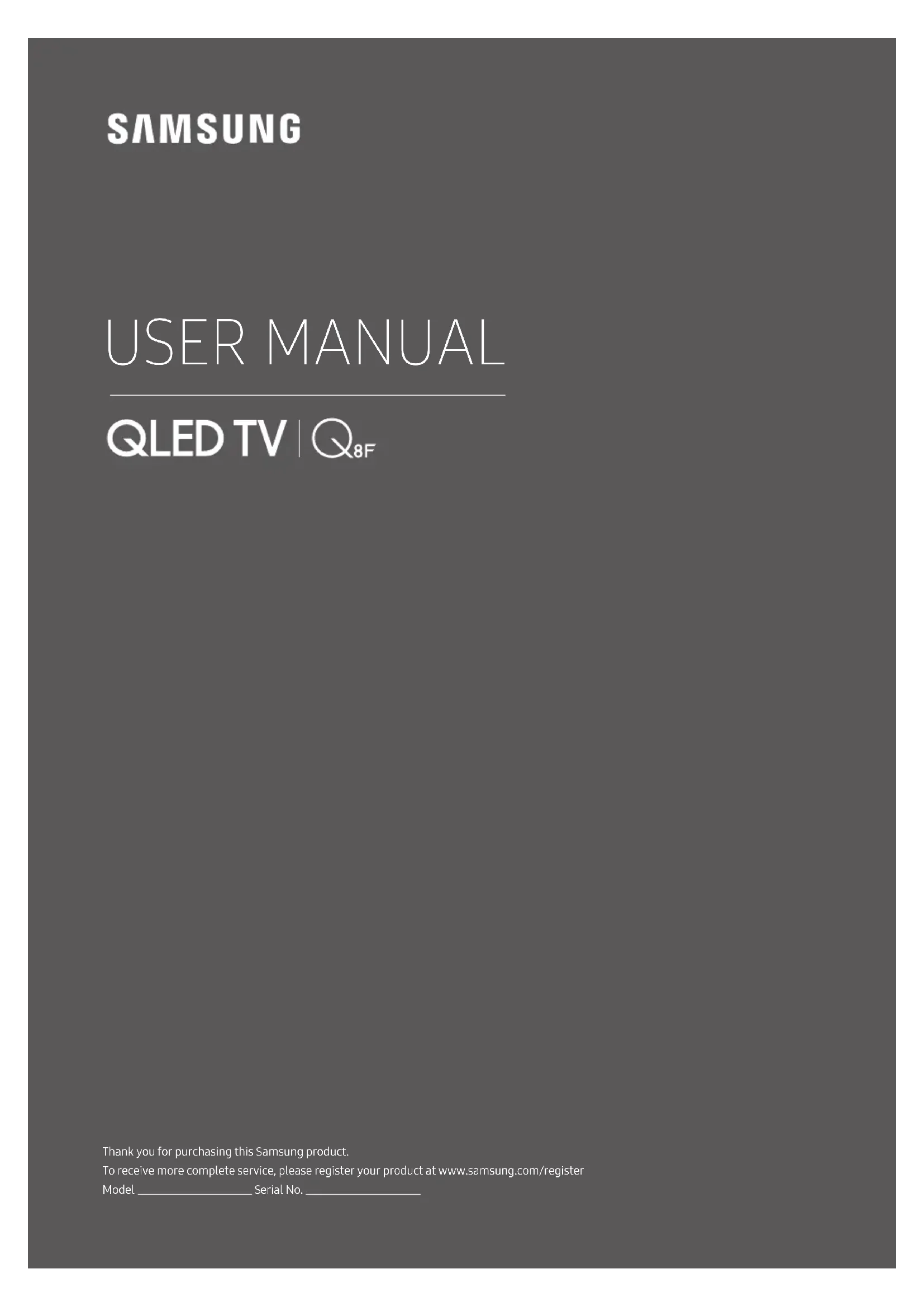 USER MANUAL Thank you for purchasing this Samsung product. To receive more complete service, please register your product at www.samsung.com/register Model Serial No.English - 2 Before Reading This User Manual This TV comes with this user manual and an embedded e-Manual. Before reading this user manual, review the following: User Manual Read this provided user manual to see information about product safety, installation, accessories, initial conguration, and product specications. e-Manual For more information about this TV, read the e-Manual embedded in the product.